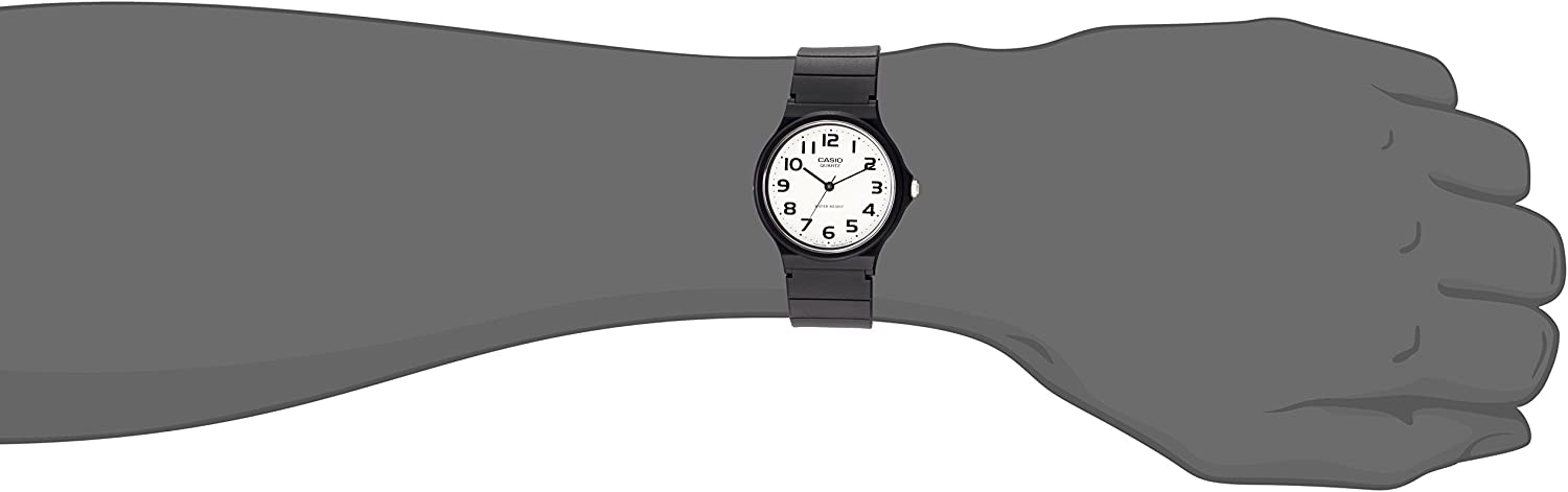 With a classically casual style, the quartz-powered Casio Men's Analog Bracelet Watch #MQ24-7B2 features a white dial face, which is embellished with stand-out Arabic numerals and minute indexes and comes protected by a durable mineral dial window. A black resin band is equipped with a sturdy buckle clasp. Other details include a black-tone, plastic, stationary bezel and 35-millimeter plastic case. Sleek and sporty, this handsome timepiece brings an easy functionality to your fast-paced lifestyle.