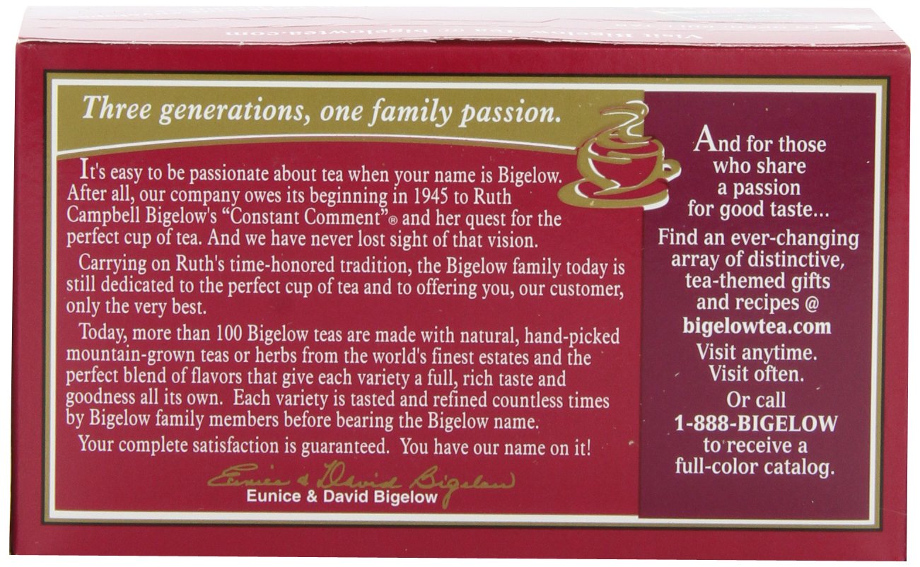 • Blended and Packaged in the USA: In 1945 Ruth Campbell Bigelow created our first tea, Constant Comment, a strong, flavorful black tea blended with aromatic orange peel and sweet warming spices. Today, Bigelow is still 100% Family Owned