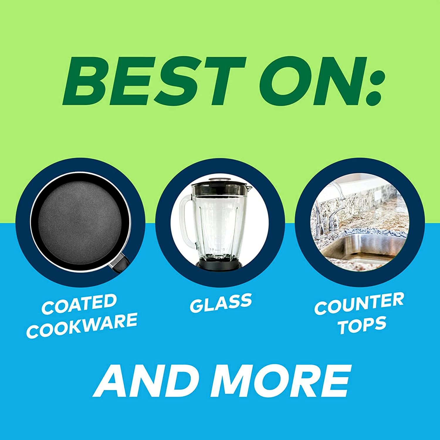 - Safe on non-stick cookware, countertops, showers, tubs, and more