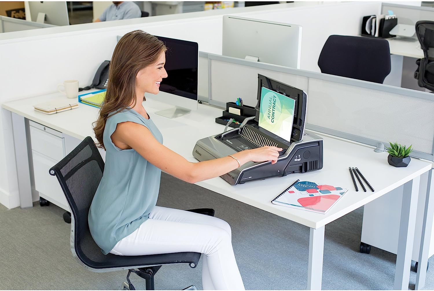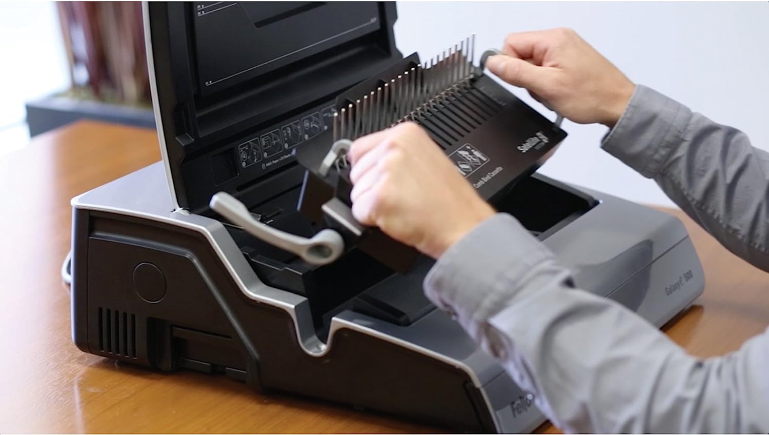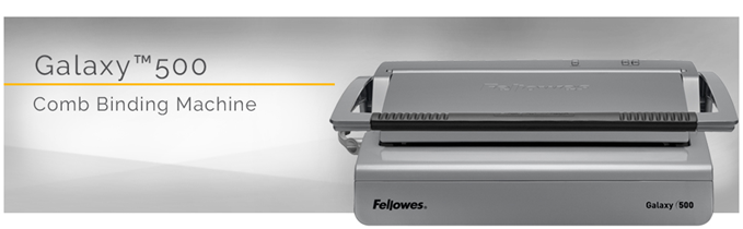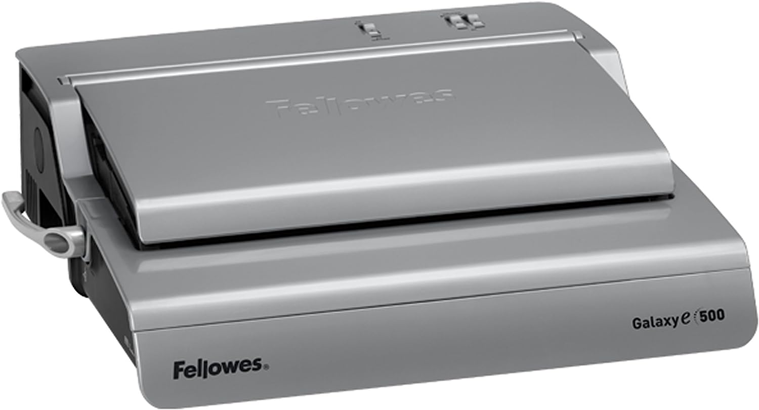 The high performance Fellowes Galaxy E Comb Binding Machine features effortless electric operation for large offices. Punches up to 25 sheets at the touch of a button and binds up to 500 sheets with a 2 Inches comb. Vertical document loading ensures accurate punch alignment. Removable binding mechanism can be used separately for increased productivity. Releasable dies for different document sizes. Features built-in comb storage tray with integrated document measurement device for added convenience and quick set-up. Adjustable edge guide centers documents with ease. Includes front-access waste tray and binding starter pack (contents: 20 pack assorted kit).
