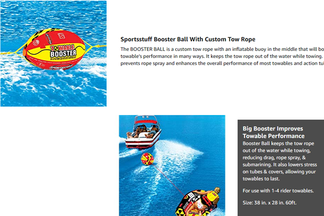 The Booster Ball is a custom towable tube tow rope with an inflatable buoy in the middle. The Booster Ball system provides a way to keep a towable tube rope elevated out of the water during the ride. It also increases the visibility of the tow line at all times. The increased height of the tube towline reduces line drag and absorbs shock to allow for quicker starts and reduced rope spray.