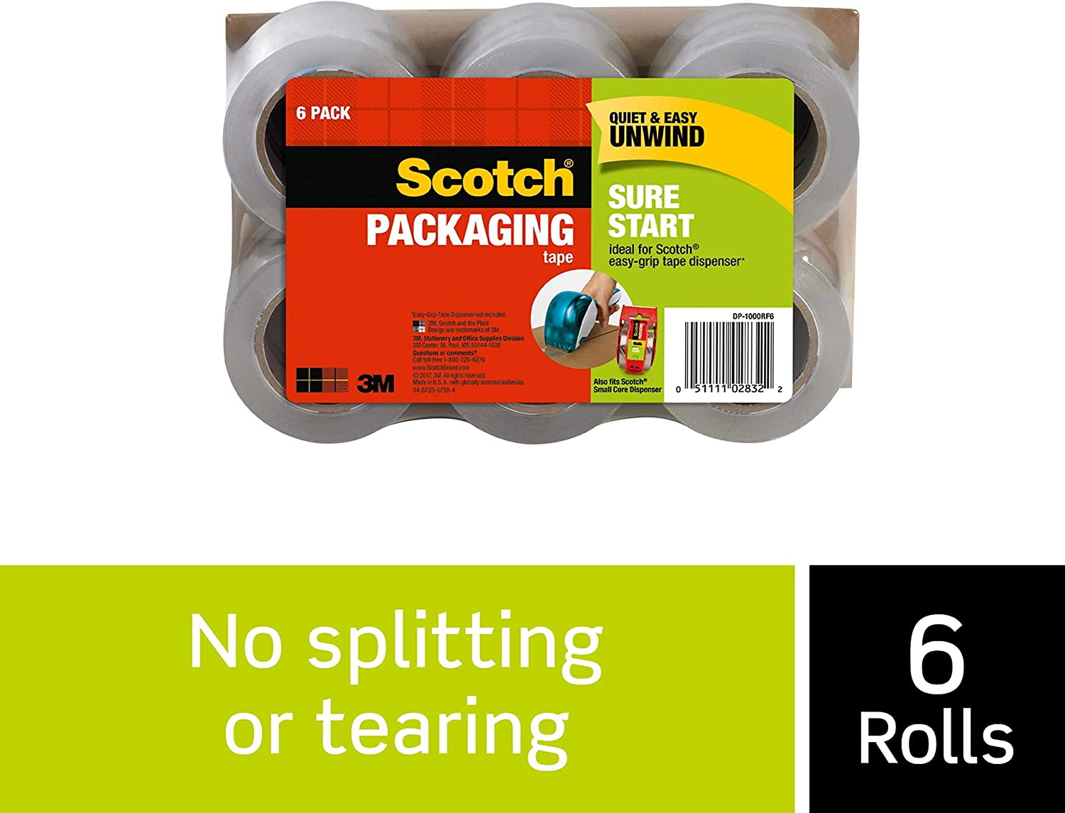 Scotch Sure Start Shipping Packaging Tape, 1.88" x 25 yd, Designed for Packing, Shipping and Mailing, Quiet Unwind, No Splitting or Tearing, 1.5" Core, Clear, 6 Rolls (DP-1000RF6)