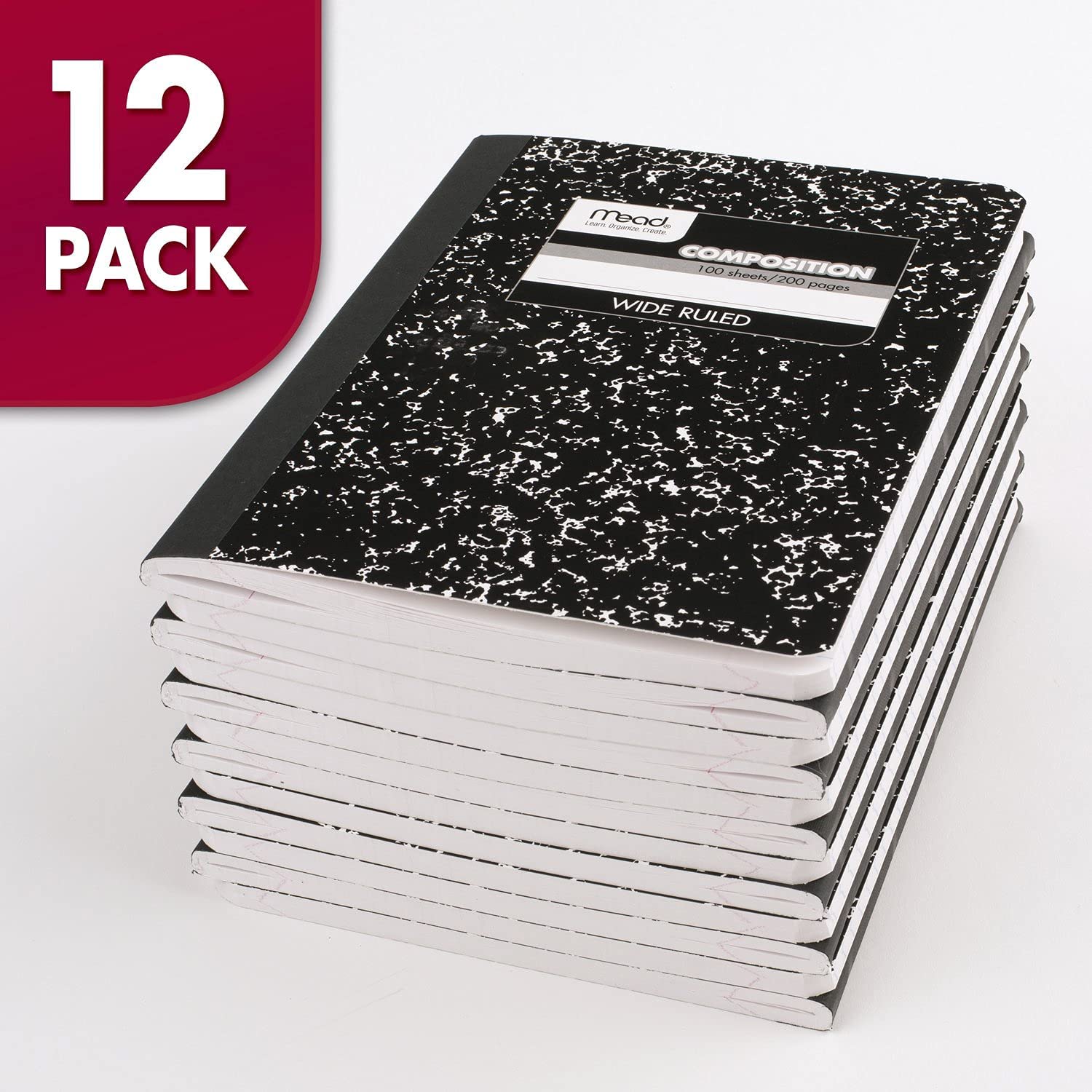 This Mead Composition Book is the classic choice for journaling and lab notes. Sheets measure 9 3/4" x 7 1/2". With 100 double-sided, wide ruled sheets, you’ll have plenty of space to take notes, journal, draw and more. Wide ruling is ideal for the younger student who needs more space between lines. Smooth binding keeps pages securely in place and won’t snag on your clothing or backpack. Black marble cover that includes a class schedule, multiplication tables, conversion tables and grammar rules. Sewn binding is smooth and keeps pages securely in place. Lays flat on any surface. Pack includes 12 composition books.