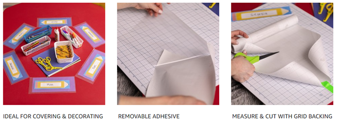 • Paper lining on back of adhesive laminate includes guidelines for easy measuring and cutting to ensure straight lines - just measure, cut, peel and stick