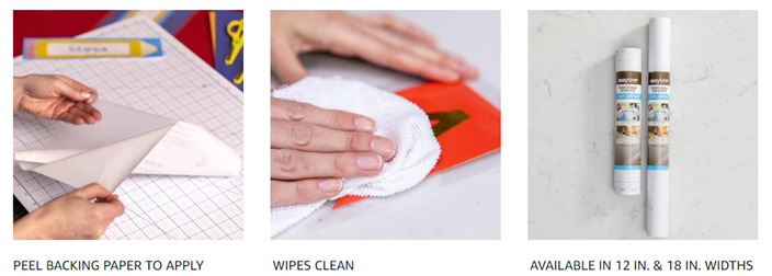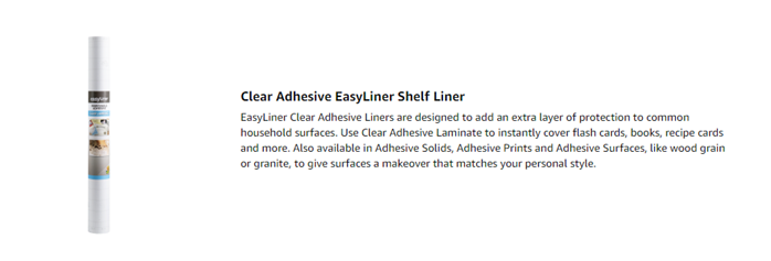 Easily and inexpensively add extra protection to household objects with Duck Brand EasyLiner Adhesive Clear Laminate Shelf Liner. Instantly cover and protect flash cards, books or recipe cards. The pre-printed paper backing makes it easy to measure and cut liner to size. Easy to use - just cut, peel and stick. Plus, it's easy to wipe clean and works great with die cutting machines.
