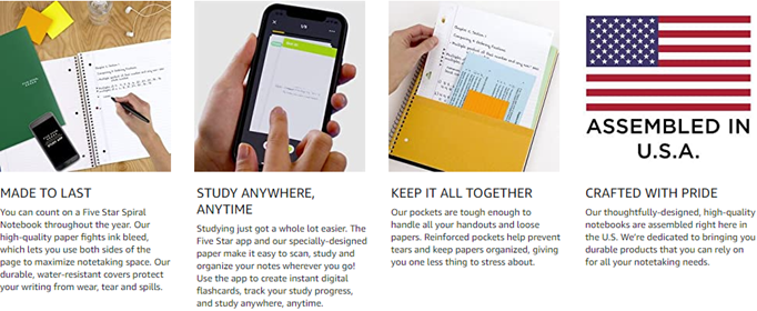 LASTS ALL YEAR. GUARANTEED!* This Five Star 3 Subject Notebook is full of features. Compatible with the Five Star study app, you can easily scan, study and organize notes on your phone! Create instant digital flashcards and sync notes to Google Drive and access them anywhere from any device. 3 subject notebook has 150 double-sided, college ruled sheets, which fight ink bleed. Sheets measure 8-1/2" x 11" and are perforated for easy tear out. Tough pockets help prevent tears and hold 8-1/2" x 11" loose sheets and handouts. Covers are water resistant to protect your notes and our Spiral Lock wire helps prevent snags on clothes and backpacks. Made with SFI certified paper. Notebook is recyclable – just remove the reinforcement tape on the pocket and recycle the rest! Available in Fire Red. *Guarantee is valid for one year from purchase date. Does not cover misuse.