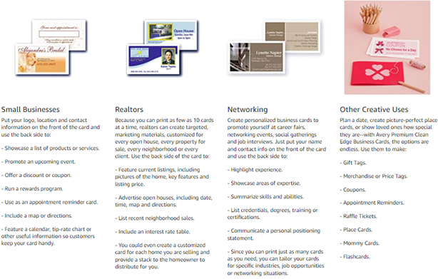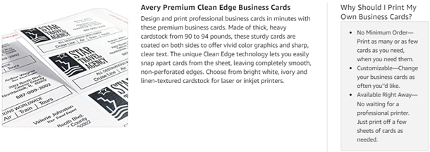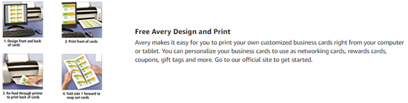 • Each sheet of business cards features proprietary Avery Sure Feed technology designed to help with alignment and reduce printer jams