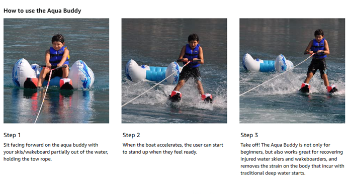 - WATER SKIING TIPS: When seated on the Aqua Buddy, skiers should hold onto the tow rope while the boat slowly advances. When the rope has no slack and starts to pull the skier, simply focus on balancing the skies and stand up, leaving the Aqua Buddy behind