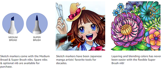 - 【REPLACEABLE NIBS】SUPER BRUSH & MEDIUM BROAD: The flexible brush nib is ideal for blending, shading, and for drawing both thick and thin strokes. The broad nib is perfect for producing consistent lines and for adding details to your creations. The broad nib can be also used with the Copic ABS (Airbrush system).