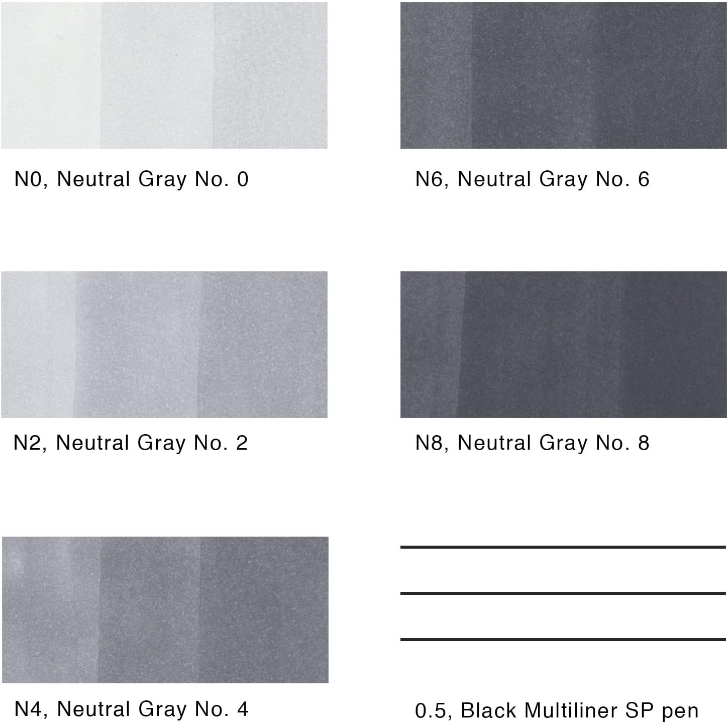 - This 6 piece Sketching Grays set includes a combination of neutral gray colors N0, N2, N4, N6, N8, and a black 0.5 Multiliner SP pen. This set is perfect for sketching, designing, and illustrating.