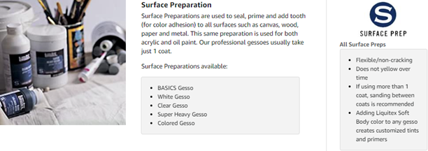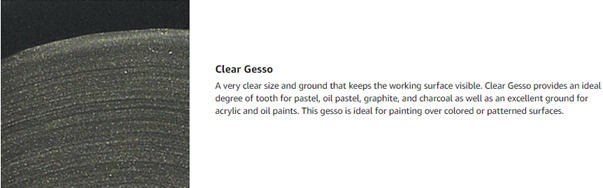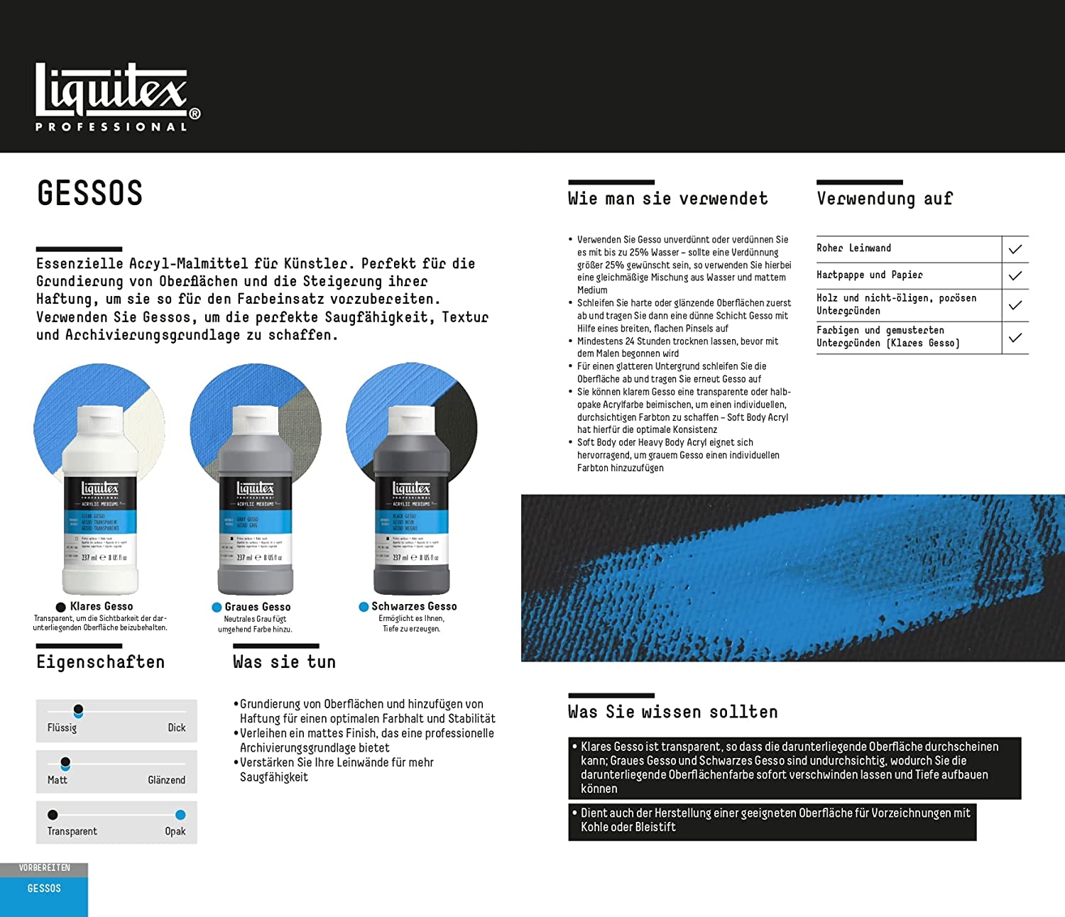 Liquitex offers the broadest range of acrylic mediums to inspire creativity at every stage of the painting process. Surface Prep Mediums are used to seal prime and add tooth (for color adhesion) to all surfaces such as canvas wood paper and metal. This same preparation is used for both acrylic and oil paint. Our professional gessoes usually take just one coat, and adding Liquitex Soft Body color to any gesso creates customized tints and primers. Liquitex Clear Gesso Surface Prep Medium is an ideal high tooth for pastel oil pastel graphite and charcoal.  Excellent ground for acrylic and oil paint.  Mix with acrylic color to have a tinted ground.  Dries clear to translucent depending on thickness.  Excellent base coat primer for many applications, including murals. Can be applied to any material or surface that will accept traditional acrylic media, such as canvas, paper, wood, etc.  Liquitex Surface Prep Mediums are lightweight, non-toxic, and dry to a water-resistant, non-yellowing surface. APPLICATION: For canvas, paper, wood, or any clean porous non-oily surface. Sizes and primes while maintaining the original appearance of the surface. Provides paper with good tooth for chalk and oil pastel techniques. Mix with a very small amount of transparent or translucent acrylic color to tint the ground, while maintaining transparency. Visit our Liquitex Amazon Storefront for full product assortment.