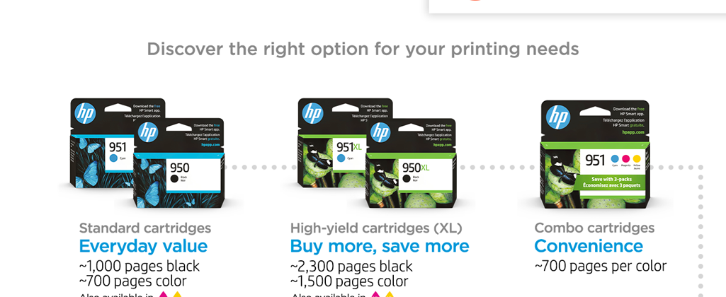 Expect professional-quality documents when you use Original HP printer ink and toner cartridges. Dependable performance, consistent page yields, and standout results are the norm – something the competition can’t match. With Original HP Ink and Toner cartridges, you can also avoid costly reprints and help ensure the flawless performance you expect from your HP printer.
