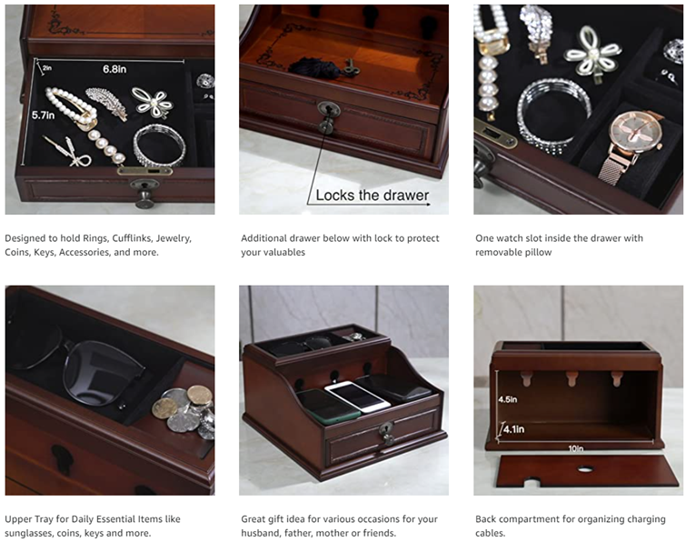 Arolly Wood Finish Valet Charging Station Multi Device Cord Organizer with Pull Out Drawer Compatible with iPhone, Samsung, and other Smartphones, Can Store Watches, Jewelry and more
