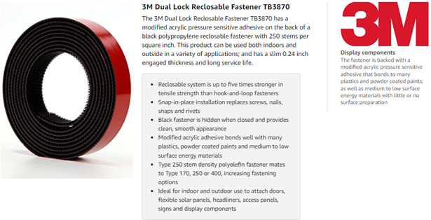 3M Dual Lock Reclosable Fasteners are used extensively in transportation, electronics, business equipment, machinery, medical, and sign and display markets They are ideal for both indoor and outdoor applications including, attaching signs, cushions, enclosure and access panels, banners, doors, adjustable shelving, vehicle ceiling panels, furniture seats and backs, and much more As a general rule, four square inches of fastener area per pound of static tensile or shear load to be supported (4in2 and lb) is suggested as a starting point for evaluation More or less area may be needed depending on specific conditions or end use applications Do not use too much of the reclosable fastener or it will be extremely challenging to separate the two parts Pry off with a screwdriver if necessary Customer is solely responsible for evaluating the product and determining whether it is appropriate and suitable for customer’s application