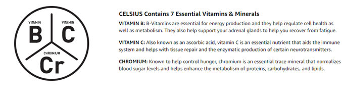 CELSIUS is packed with 7 essential vitamins, contains zero sugar, no artificial colors, no aspartame and no high fructose corn syrup.