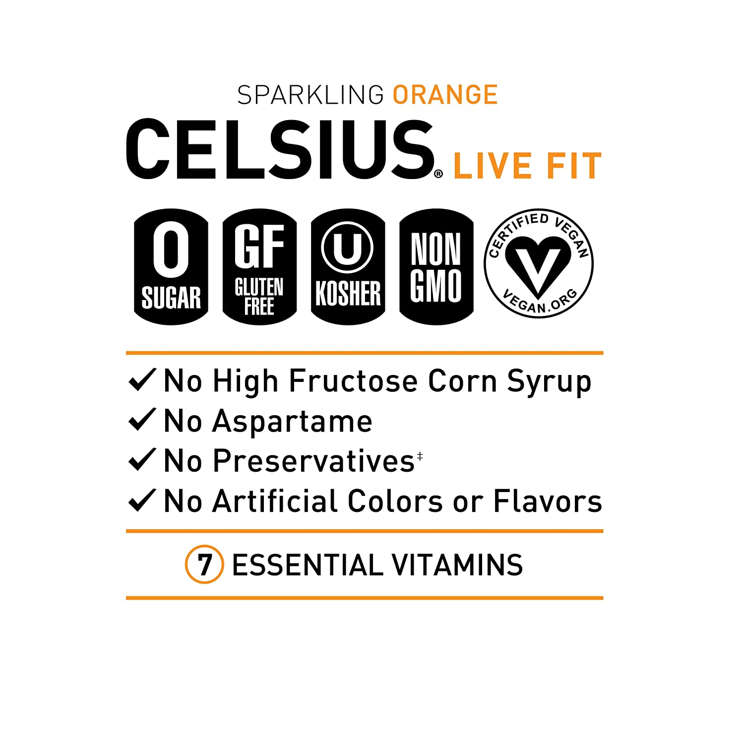 CELSIUS is functional, Essential Energy, a better-for-you, premium alternative to traditional energy drinks. As a global, lifestyle fitness drink, CELSIUS was created to help people LIVE FIT, exceed their goals and elevate their everyday lives. Made with proven, premium ingredients, 7 Essential Vitamins and zero sugar, no artificial colors, no aspartame, no high fructose corn syrup and non-GMO. CELSIUS is vegan, gluten-free and Kosher. Our proprietary MetaPlus blend contains green tea extract with EGCG. It also includes guarana seed extract, ginger root for flavor and digestion, vitamin C to help support your immune system, vitamin B for energy production, and chromium to help control hunger, making it an ideal pre-workout drink. Stay active and dazzle your tastebuds with the juicy and citrusy sweet blend of refreshing oranges. Our take on a classic, but without all the sugar! Made with clinically proven ingredients, this carbonated flavor of CELSIUS has the perfect balance of flavor and energy that serves as an awesome pick-me-up for active lifestyles. Make CELSIUS your go-to choice for Essential Energy! CELSIUS is available in 12 oz. slim cans and sold in a 12-pack for convenience.