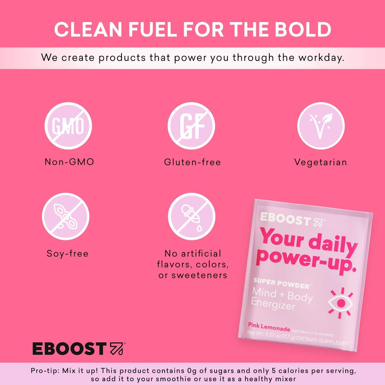 Focus And Mood Amplifier: The OG formula that started it all, EBOOST SUPER POWDER is an all-in-one little packet that holds up to its name. Experience natural daily wellness with our transformative formula that offers energy, vitamins, minerals, antioxidants, electrolytes, and mood and alertness support. Flavor: Pink Lemonade