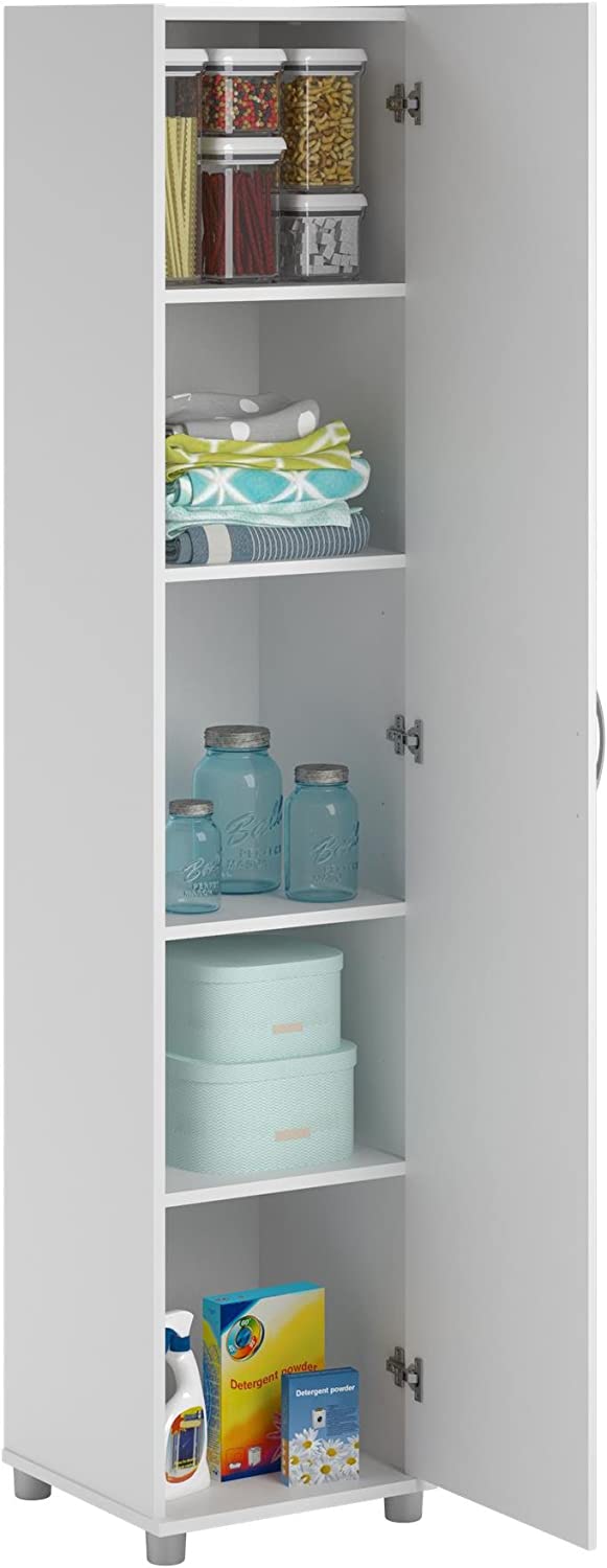 The 5 shelves, 3 adjustable, can store and organize your cleaning supplies and even kitchen pantry items. Soft closing hinges prevent slamming doors. Adjustable feet keep your cabinet level on uneven floors