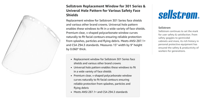 Replacement window for Sellstrom 301 Series face shields and various other brand crowns. Universal hole pattern enables these windows to fit in a wide variety of face shields. Premium clear, v-shaped polycarbonate window curves naturally to fit facial contours ensuring reliable protection from splashes, particles and flying debris. Meets ANSI Z87.1+ and CSA Z94.3 standards. Measures 15" width by 9" height by 0.060" thick. Founded in 1923, Sellstrom Manufacturing Co. is one of the oldest American brands of safety products. From safety goggles to face shields and more, our long history in pioneering industry-leading personal protective products means our equipment is designed with your safety and productivity in mind. Today, we are synonymous with the best in head, eye, face, hearing, knee and welding protective products that deliver safety, productivity, comfort and peace of mind.