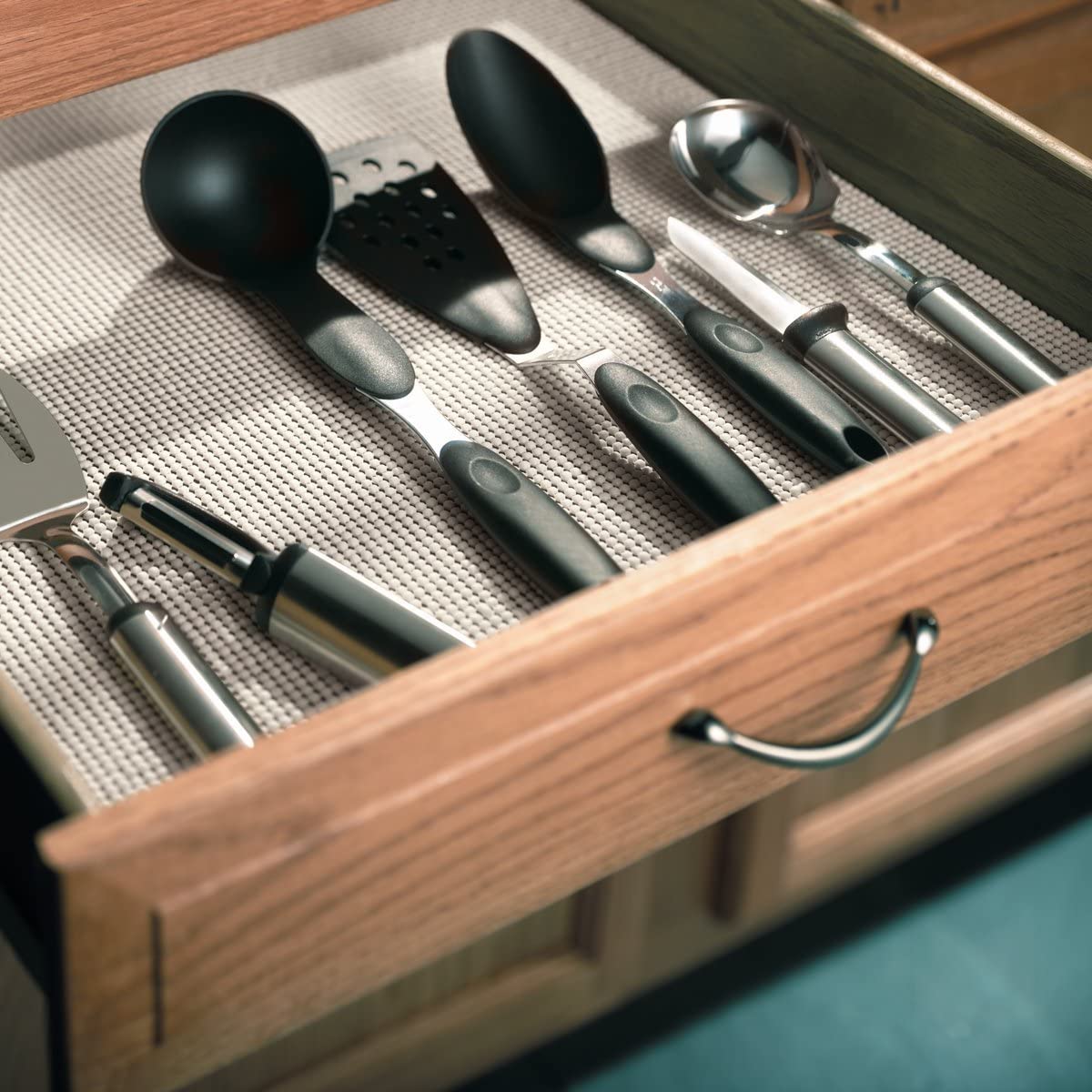 Featuring a non-adhesive grip top and bottom, you can use Select Grip EasyLiner Brand Shelf Liner in almost any type of drawer or utility cabinet to protect against scratches and keep your items in place. This shelf liner is easy to remove or replace and is available in a variety of colors, making redecorating a breeze. Pro Tip: Cover narrow drawers and cabinets with 12" and use 20" for large drawers and cabinets.