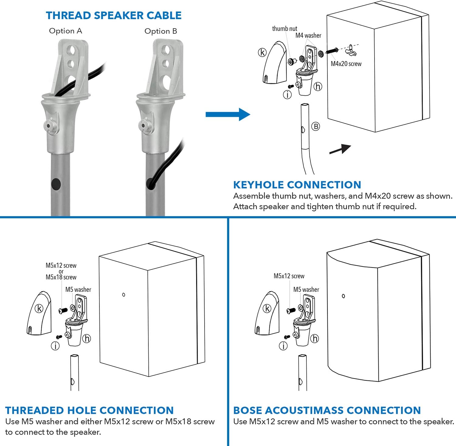 MULTIPLE SPEAKER ATTACHMENT METHODS - Including keyhole style, single bolt or screw type. Mount speakers using 1/4-Inch x 20 mounting screws or keyhole mounts; Fits Single Thread Type Fitting, all hardware provided.