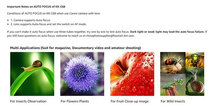 The KK-C68 Extension tubes are designed to enable a lens to focus closer than its normal set minimum focusing distance. Getting closer has the effect of magnifying your subject (making it appear larger in the viewfinder and in your pictures). They are exceptionally useful for macro photography, enabling you to convert almost any lens into a macro lens at a fraction of the cost while maintaining its original optical quality. This Autofocus Extension Tube Set (12/20/36mm) for Canon from Micnova contains three tubes of different length, a 12 mm, 20 mm and 36 mm, which can be used individually or in any combination to obtain the desired magnification. (An individual 25mm autofocus extension tube is available).