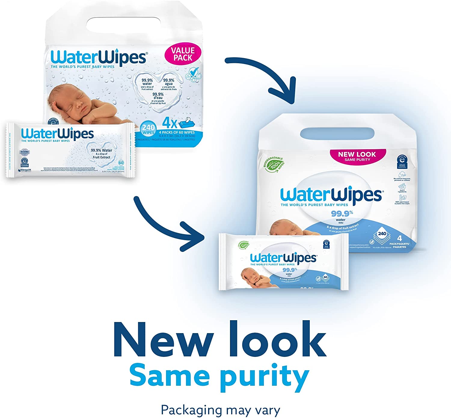 WaterWipes Plastic-Free Original Baby Wipes, 99.9% Water Based Wipes, Unscented & Hypoallergenic for Sensitive Skin, 240 Count (4 packs), Packaging May Vary