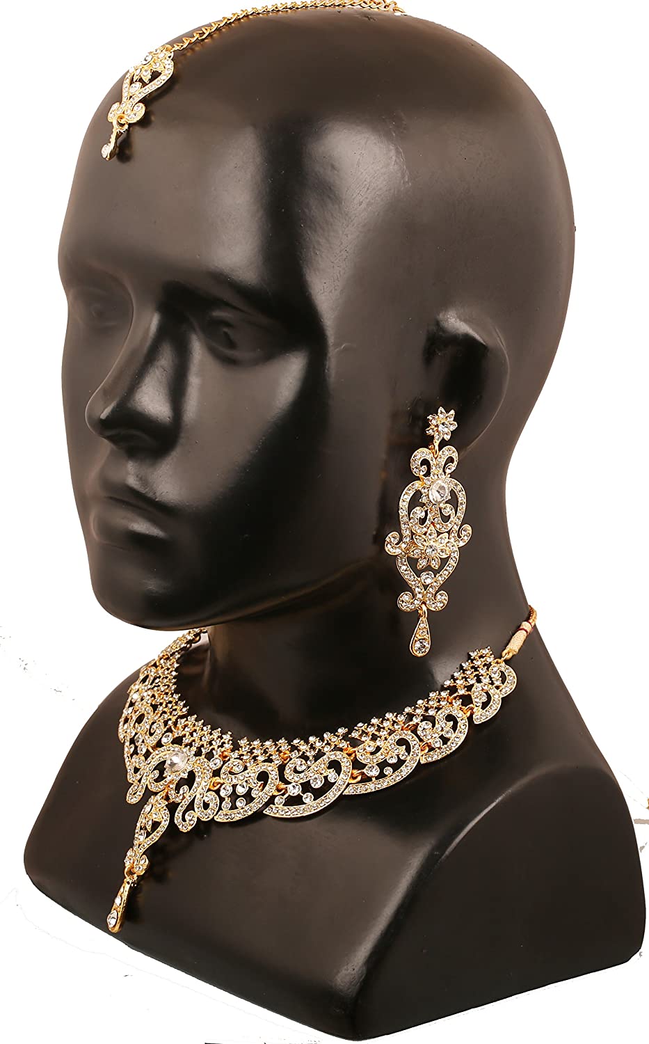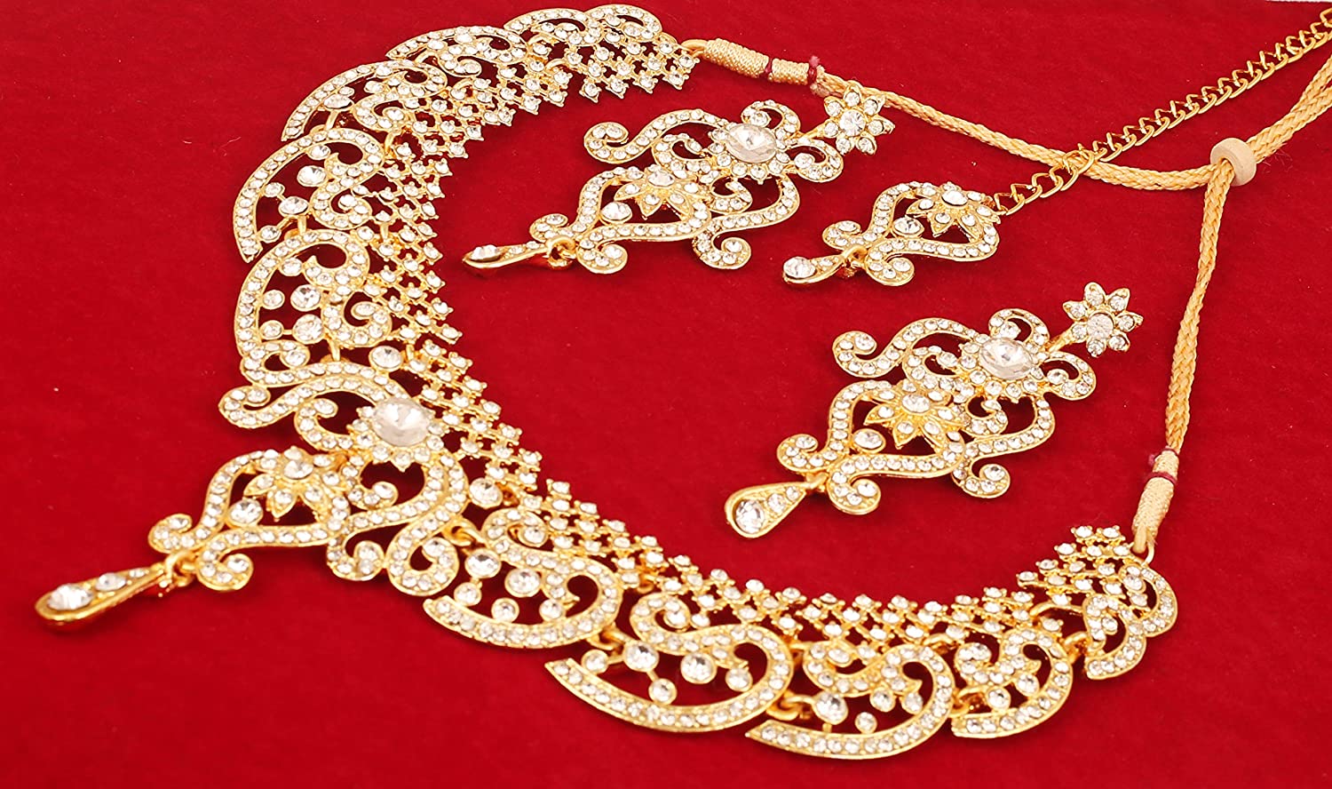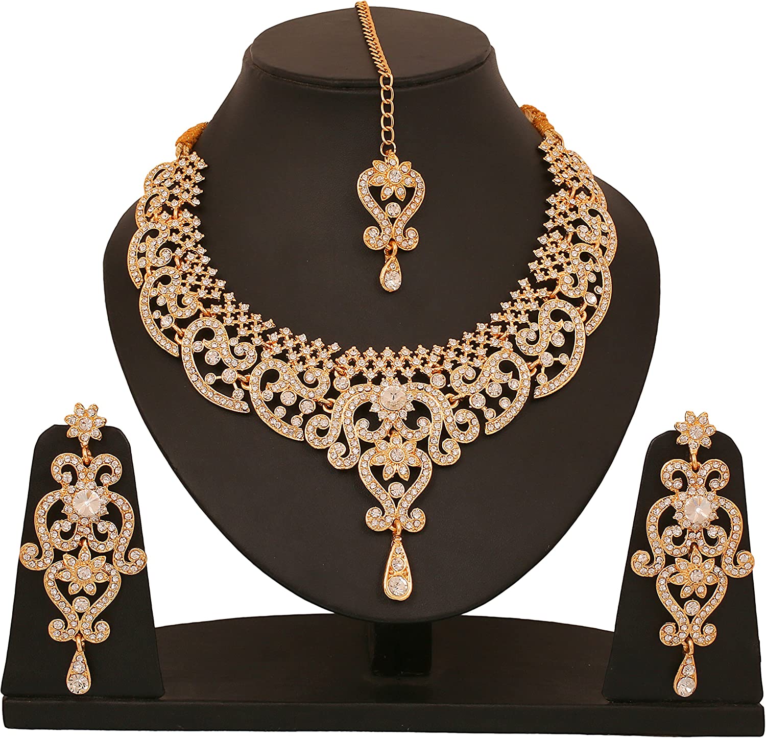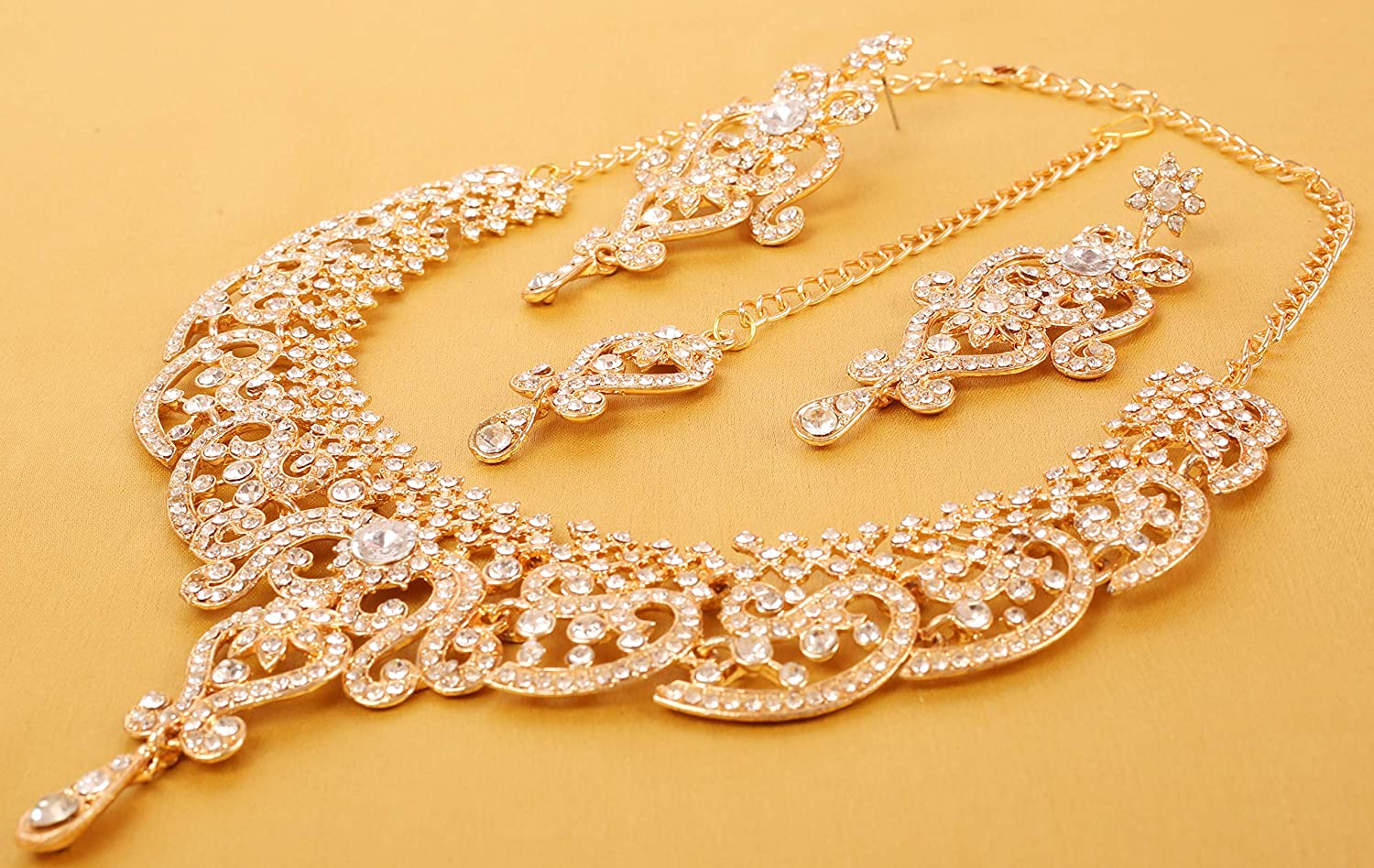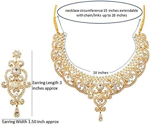 - Touchstone Indian Bollywood Choice Rich Traditional Exclusive Floral Workmanship Sparkling Rhinestone Designer Jewelry Grand ModernBridal Necklace Set With Mangtiak In Gold Tone For Women. EXTRA LONG EARRINGS. Length 3 inches SPECIFICATIONS : V shape necklace. Necklace circumference 18 inches. Earring weight (single) 18 gms. Earring length 3 inches . Earring width 1.25 inch.