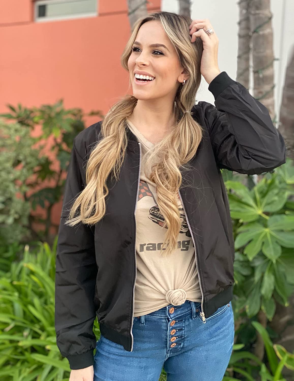 [Material]: The bomber jacket is made of lightweight, high-quality fabric. It is a very basic solid color coat