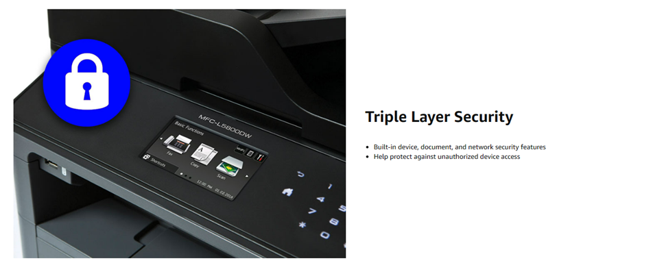• ADVANCED SECURITY FEATURES: MFCL5800DW helps protect against unauthorized device and document access, and securely connect to your network