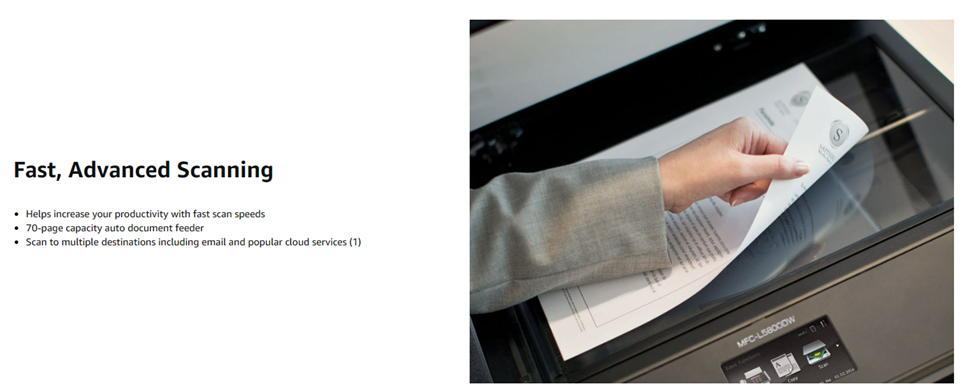 • INNOVATIVE SCANNING CAPABILITY: Supports multiple scan-to destinations such as email, USB, SharePoint, Cloud Services, Network, and more. (1) First Page Out Time 7. 2 seconds max. Printer Driver Compatibility Windows, macOS, Linux. Black Print Speed max. 42 ppm. (2) Mobile Device Compatibility AirPrint, Brother iPrint&Scan, Mopria, Cortado Workplace, Wi-Fi Direct (3)