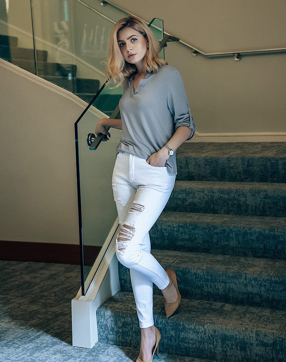The V-neck shirt shows off an elegant, stylish look that works well with business attire such as tight skirts, wide-leg pants, suit pants and heels