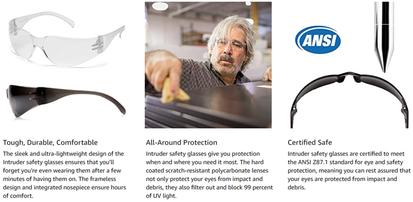 • ECONOMICAL: Many safety glasses and goggles cost up to 50 dollars while offering the same protection as our Intruder Eyewear. Our safety glasses are just as effective as their competitors at a fraction of the cost.
