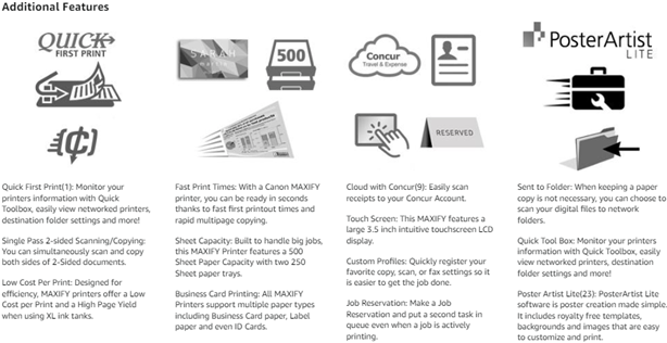 1. Document print speeds are the averages of ESAT in Office Category Test for the default simplex mode, ISO/IEC 24734. Document print speeds are the averages of FPOT in Office Category Test for the default simplex mode, ISO/IEC17629:2014. Print speed may vary. During successive printing, the printer may slow down the operation to prevent the internal temperature from rising. depending on system configuration, interface, software, document complexity, print mode, page coverage, type of paper used etc. Copy speeds are the average of sFCOT and sESAT, ISO/IEC 29183. Copy speed may vary depending on document complexity, copy mode, page coverage, type of paper used etc. and does not take into account warming up time. When scanning or copying a certain volume of documents (approx. 150 sheets in default settings) continuously from the ADF,the printer may switch to 'waiting mode' in which paper feeding stops for several tens of seconds after each scan to prohibit overheating the ADF. See usa.canon.com/ipm for additional details. 2. Duty Cycle is defined as the maximum number of printed pages for a single peak month. 3. Requires an Internet connection and the Canon PRINT Inkjet/SELPHY app, available for free on the App Store and at Google Play. Compatible with iPad, iPhone 3GS or later, and iPod touch 3rd generation or later devices running iOS 7.0 or later, and Android mobile devices running Android 2.3.3 or later. Your device must be connected to the same working network with wireless 802.11 b/g/n capability as your printer. For users of compatible Apple mobile devices, document printing requires Apple AirPrint, which requires an AirPrint-enabled printer connected to the same network as your iOS device. A printer connected to the USB port of your Mac, PC, AirPort Base station, or Time Capsule is not supported. 4. AirPrint functionality requires an iPad, iPhone 3GS or later, or iPod touch 3rd generation or later device running iOS 4.2 or later, and an AirPrint-enabled printer connected to the same network as your iOS device. A printer connected to the USB port of your Mac, PC, AirPort Base station, or Time Capsule is not supported. 5. Requires an Internet connection and Google account. Subject to Google Terms of Service. Certain exceptions may apply. 6. Requires Android mobile device with Android 4.4 operating system or later with the Mopria Print Service pre-loaded with that device and the compatible PIXMA/MAXIFY printer on the same wireless network. The Mopria experience is also available on Android 4.4 mobile devices with a download of the Mopria Print Service from Google Play. | 7. Wireless printing requires a working network with wireless 802.11b/g or n capability. Wireless performance may vary based on terrain and distance between the printer and wireless network clients. 8. Resolution may vary based on printer driver setting. Color ink droplets can be placed with a horizontal pitch of 1/600 inch at minimum. 9. Scan to Concur requires a valid Concur account. Scanned files have a 10MB volume limit, with a 100 page maximum. Multiscan not available, receipts uploaded to Concur Cloud. 10. ADF scan speeds are the average of scESAT30secA in 'ADF Productivity Measurement' test, ISO/IEC 17991:2015. Scan to network folder speeds with ADF are the average of scEFTP30secF in 'Scan to Network Folder Productivity Measurement' test, ISO/IEC 17991:2015. ADF scan speeds/Scan to network folder speeds with ADF will vary depending on system configuration, interface, software, document complexity etc. When scanning or copying a certain volume of documents (Approx. 150 sheets in default settings) continuously from the ADF, the printer may switch to 'waiting mode' in which paper feeding stops for several tens of seconds after each scan to prohibit overheating the ADF. 11. Optical resolution is a measure of maximum hardware sampling resolution, based on ISO 14473 standard. 12. The Public Switched Telephone Network currently supports fax modem speeds of 28.8 Kbps or lower, depending on telephone line conditions. Sending and receiving fax machines need to conform to ITU-T v.34 guidelines. 13. Black and white document fax transmission speed is based on default setting using ITU-T No.1 chart. Color document fax transmission speed is based on default setting using Canon Color Fax Test Sheet. Actual transmission speed varies depending on document complexity, fax setting at receiving end, and line conditions etc. 14. Page count is based on ITU-T No.1 chart or Canon FAX Standard Chart No.1. The number of pages able to be kept in memory will vary based on remaining memory capacity and document complexity. 15. High Page Yield calculated when using Canon Genuine XL Ink Tanks. 16. Requires an Internet connection. 17. Acoustic Noise is measured based on ISO7779 standard. 18. Operation can only be guaranteed on a PC with factory-installed Windows 10, Windows 8.1, Windows 8, Windows 7, Windows Vista or XP. | 19. Available from printer driver and fax driver only. XPS drive is not supported for Windows Server 2003 and 2003 R2. 20. Internet Connection required during software installation. 21. Some functions may not be available with these Operating Systems. Please refer to the manual or our website for full details. 22. Requires a Windows RT compatible device with Windows 10, Windows 8.1 or Windows 8 and the Canon Easy-PhotoPrint app for Windows RT available for free in the Windows Store. 23. PosterArtist Lite software v2.60.00 is compatible with 64/32 bit versions of Microsoft Windows10, Windows 8.1, Windows 8, Windows 7 and Windows Vista, and only compatible with Canon PIXMA (released after July 2015), MAXIFY, imagePROGRAF and Océ printers. Minimum computer system requirements: Pentium4 2.4Ghz CPU or higher with 1GB RAM, 1024x768 pixel display and 5GB of system hard drive space. 24. Warranty programs are subject to certain conditions and restrictions. See the official website for details. 25. Dimensions with letter (A4) paper i