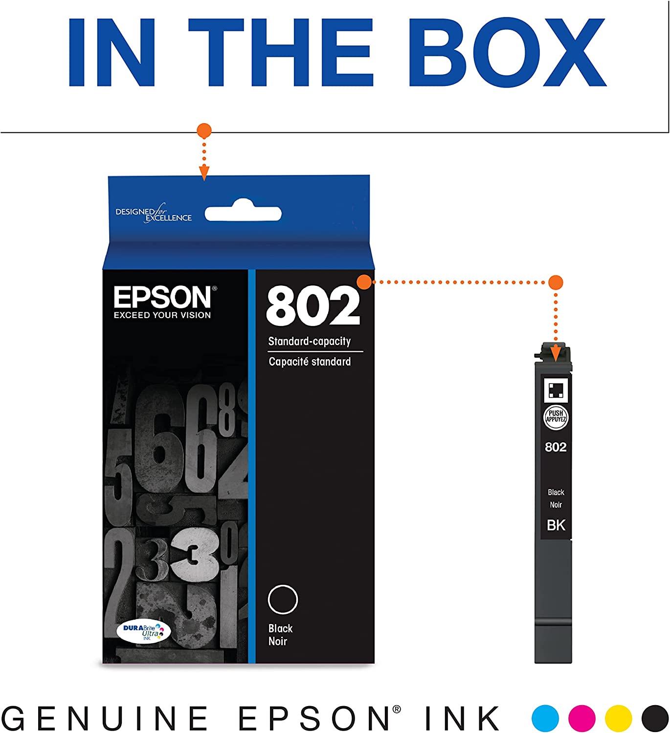Replace only the cartridge that runs out with individual ink cartridges. Best of all, only one set of cartridges is needed to print amazing documents and great photos. There’s no need to spend additional money on specialized cartridges to print on either plain or photo paper. Epson’s revolutionary DURABrite Ultra Ink produces prints that look brilliant on both plain and glossy photo paper. Epson T802120-S DURABrite Ultra Black Standard Capacity Cartridge Ink Better quality than the lab.Worry-free handling.Convenient individual ink cartridges.