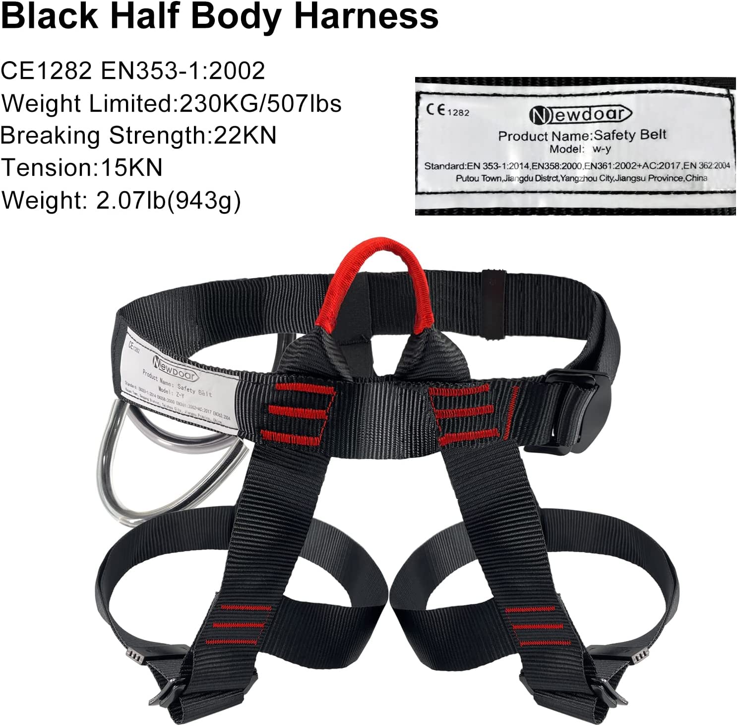 • [MATERIAL]:The half body Seat Belts is made of High strength polyester,Strong and Secure.CE 1282 EN353-1:2002, harness Weight limited:230KG/ 507 lbs, Breaking strength 22KN.Tension:15KN, Impact force: 6KN.Weight:1.23Ib(560g)