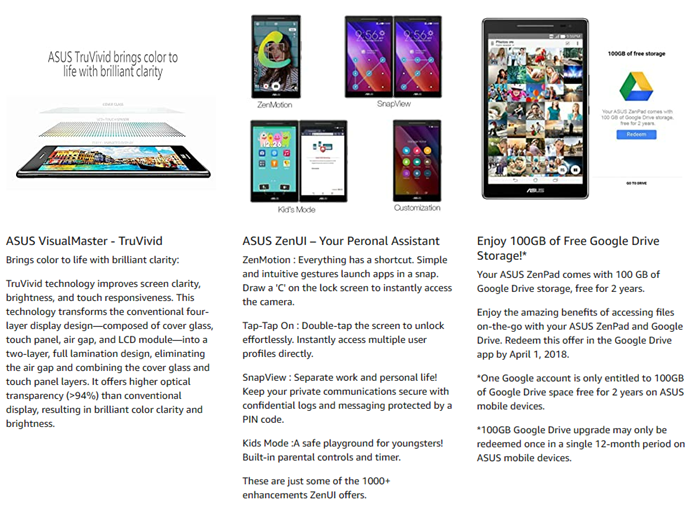 • Android 7.0 OS; Free 100GB of Google drive storage for 1 year