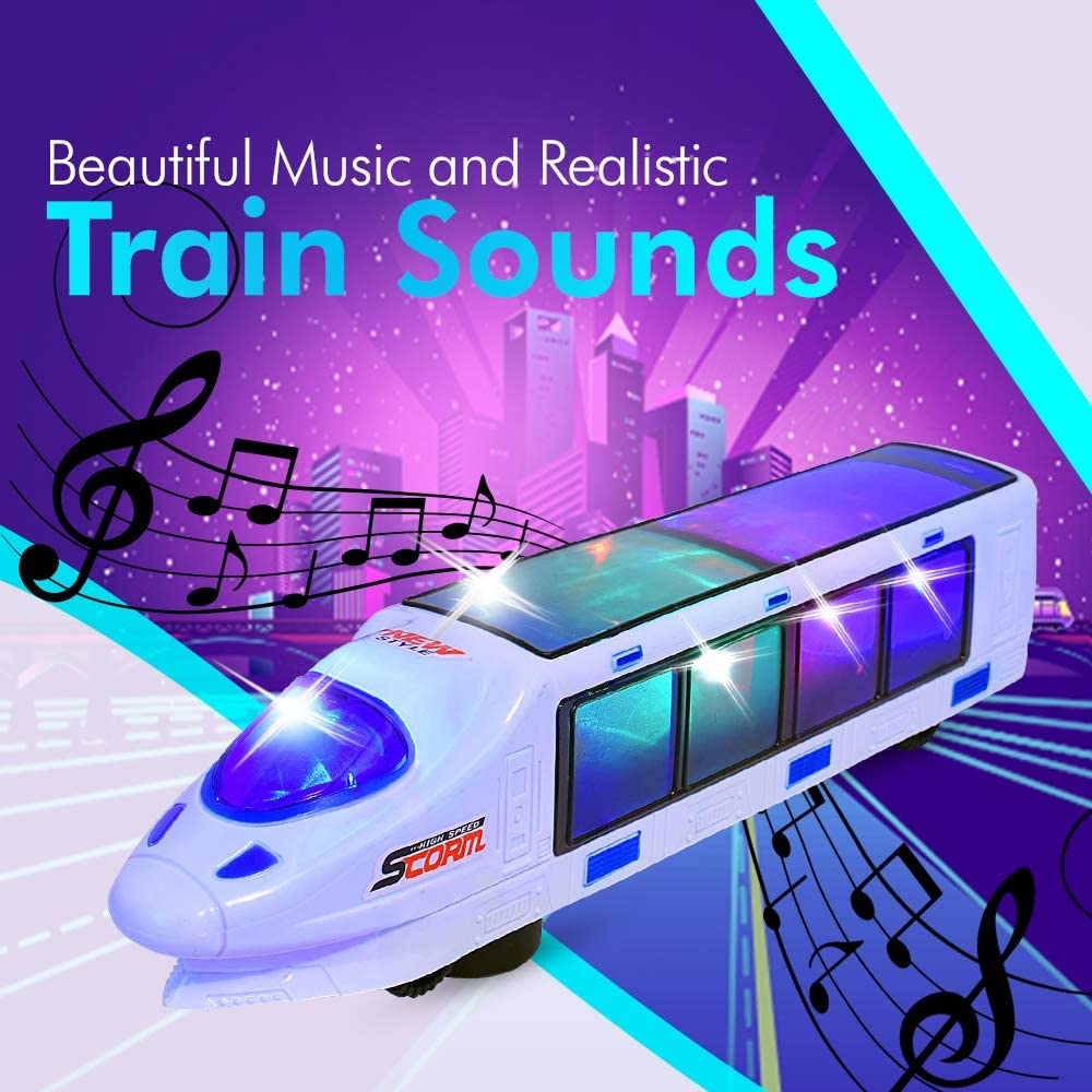 - HIGH-QUALITY CONSTRUCTION. Providing long-lasting strength and use, this Beautiful 3D Lightning Electric Train Toy is expertly crafted using durable plastic construction to withstand bumping into walls and endless hours of play.