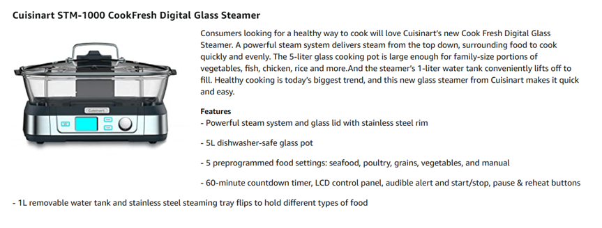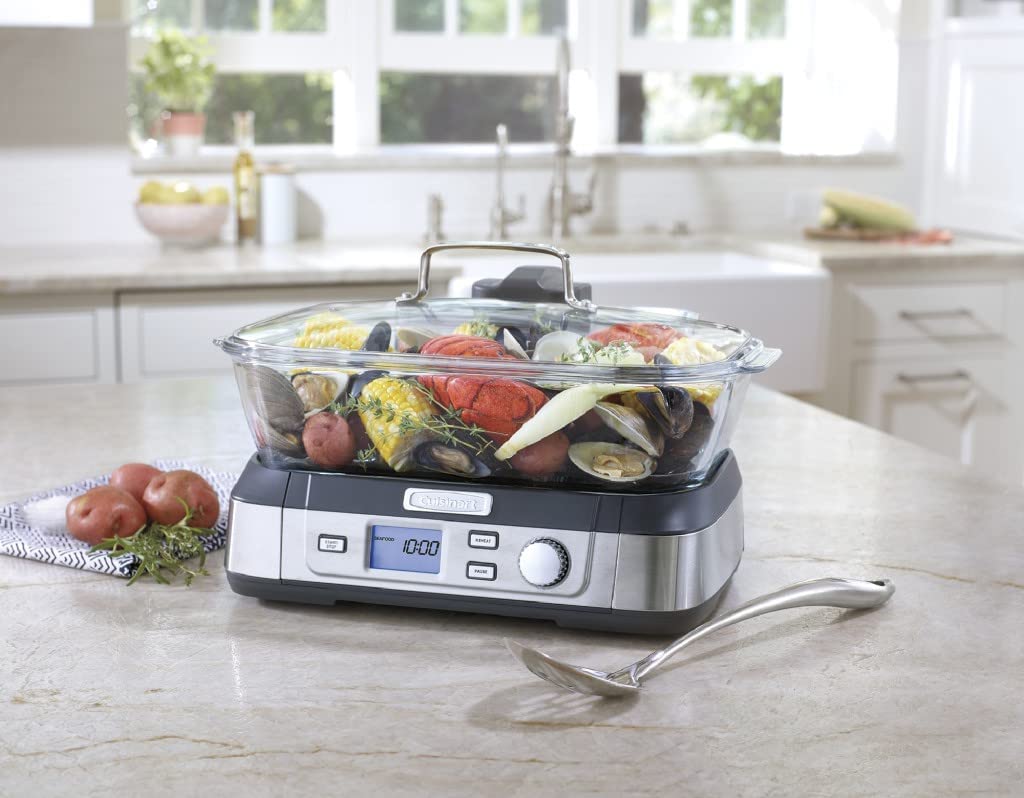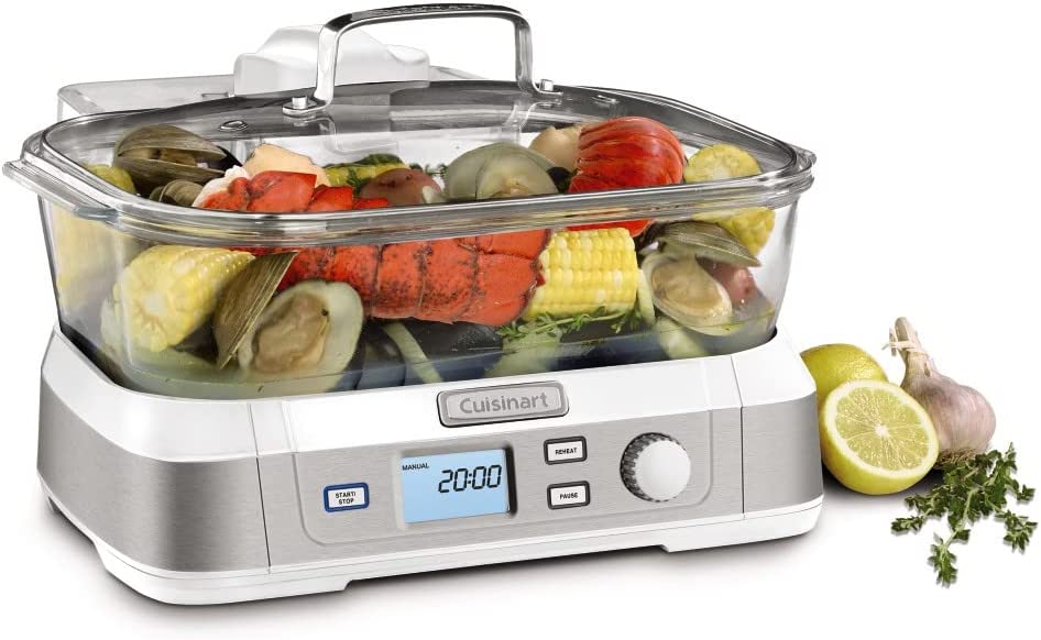 Consumers looking for a healthy way to cook will love Cuisinart's new Cook Fresh Digital Glass Steamer. A powerful steam system delivers steam from the top down, surrounding food to cook quickly and evenly. The 5-liter glass cooking pot is large enough for family-size portions of vegetables, fish, chicken, rice and more. And the steamer's 1-liter water tank conveniently lifts off to fill. Healthy cooking is today's biggest trend, and this new glass steamer from Cuisinart makes it quick and easy. Features: Powerful steam system|5L dishwasher-safe glass pot|5 preprogrammed food settings: seafood poultry grains vegetables and manual|60 minute countdown timer|LCD control panel|Audible alert|Start/Stop Pause & Reheat buttons|1L removable water tank|Stainless steel steaming tray flips to hold different types of food|Glass lid with stainless steel rim|Limited 3 year warranty|BPA-free