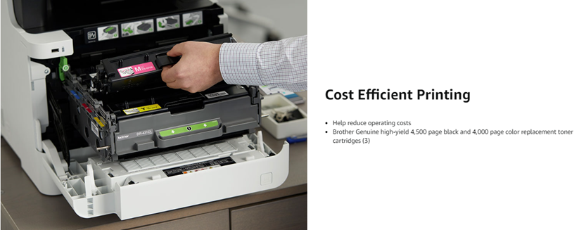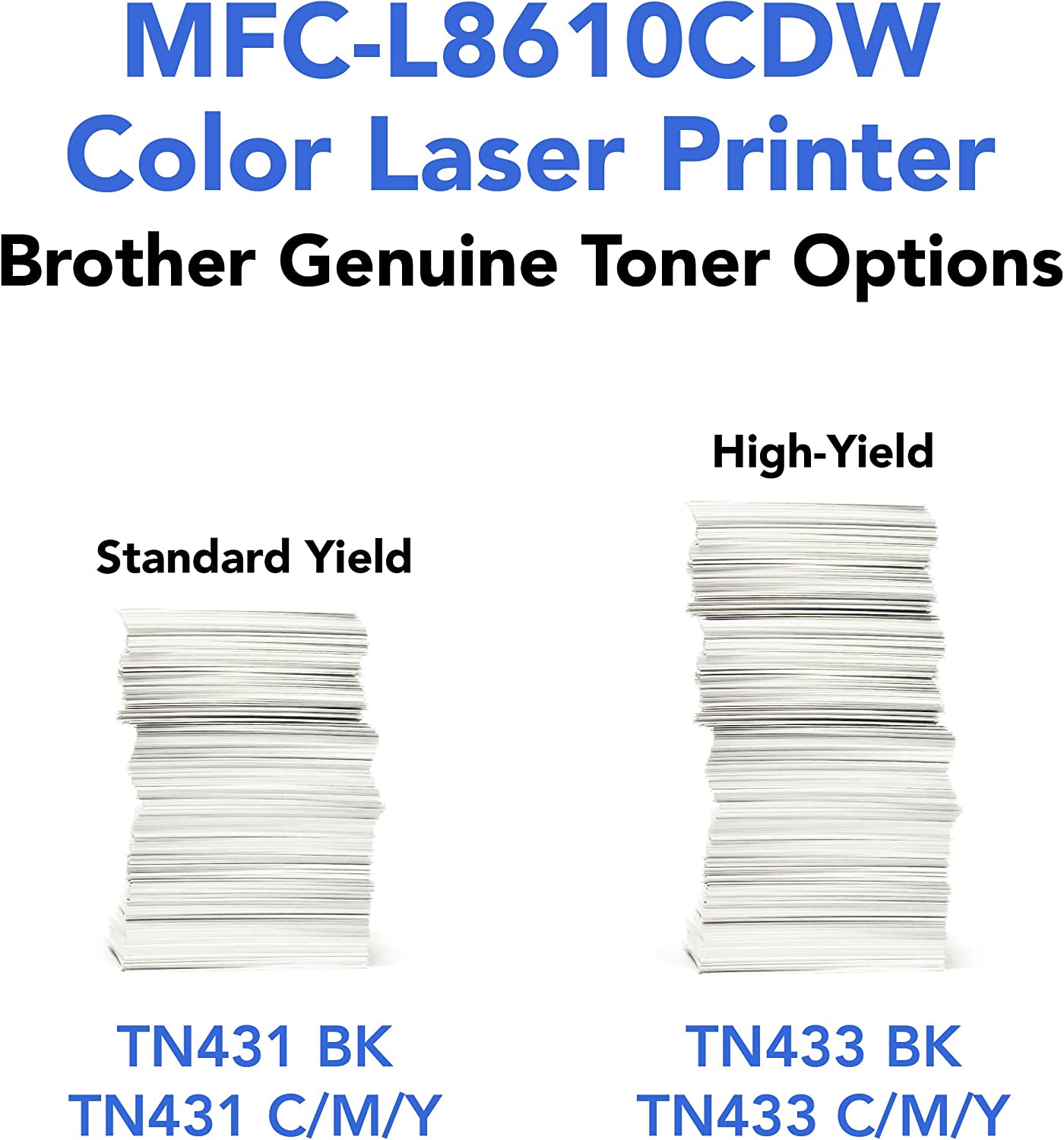 The Brother MFC-L8610CDW Color Laser All-in-One is a great choice for offices and small workgroups that need cost-efficient printing, easy scanning, secure document handling, and reliable, business-quality output. This color laser printer, copier, scanner, and fax machine was designed to enhance office productivity by delivering print speeds up to 33ppm(1) and scan speeds up to 29ipm. (6) The built-in scanning feature allows users to scan to popular destinations including e-mail, SharePoint, and business cloud services. (4) Connecting to the Brother MFC-L8610CDW is simple and convenient. Built-in wireless and Gigabit Ethernet network interfaces allow users to share the all-in-one. Plus, users can wirelessly print from a wide variety of mobile devices over a wireless network. An adjustable 3. 7″ Touchscreen display offers easy menu navigation and printing from and scanning to popular business Cloud services such as Google Drive, Dropbox, OneDrive, and more. (2) This Brother all-in-one offers a 50-page capacity automatic document feeder for copying, scanning and faxing multi-page documents. The adjustable 250-sheet capacity paper tray and 50-sheet capacity multipurpose tray make printing and copying simple. This office all-in-one can be upgraded to a 1, 050-sheet total capacity with optional trays. The MFC-L8610CDW is also Dash Replenishment enabled. This system allows the all-in-one to measure the toner level of your Genuine Brother Replacement Cartridges and automatically order replacements. This ensures you never run out of toner so that you can maintain the office efficiency you expect and require. (1)Based on one-sided printing. Change from default setting required. (2)Requires an Internet connection and an account with desired service. (3)Approximate cartridge yield in accordance with ISO/IEC 19798 (letter/A4). (4)Requires connection to a wireless network. (5)The mobile device must have NFC capability and run Android OS 4. 4 or later. (6)Scan speed measured with all advanced features turned off using LTR size test documents at 200dpi.