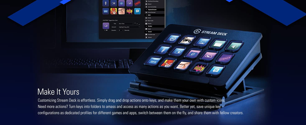 Stream Deck puts 15 LCD keys at your fingertips for ultimate studio control. Simply tap to switch scenes, launch media, tweet your feats and more. Personalize your keys with custom icons or choose from hundreds, and get visual feedback every time you execute a command. With Stream Deck, maximize your production value and focus on what matters most: Your audience. Interface Integrated USB 2.0 cable.