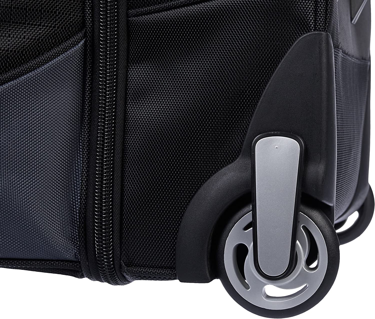 Wheeled duffel in black with grey accents for traveling in comfortable, convenient style