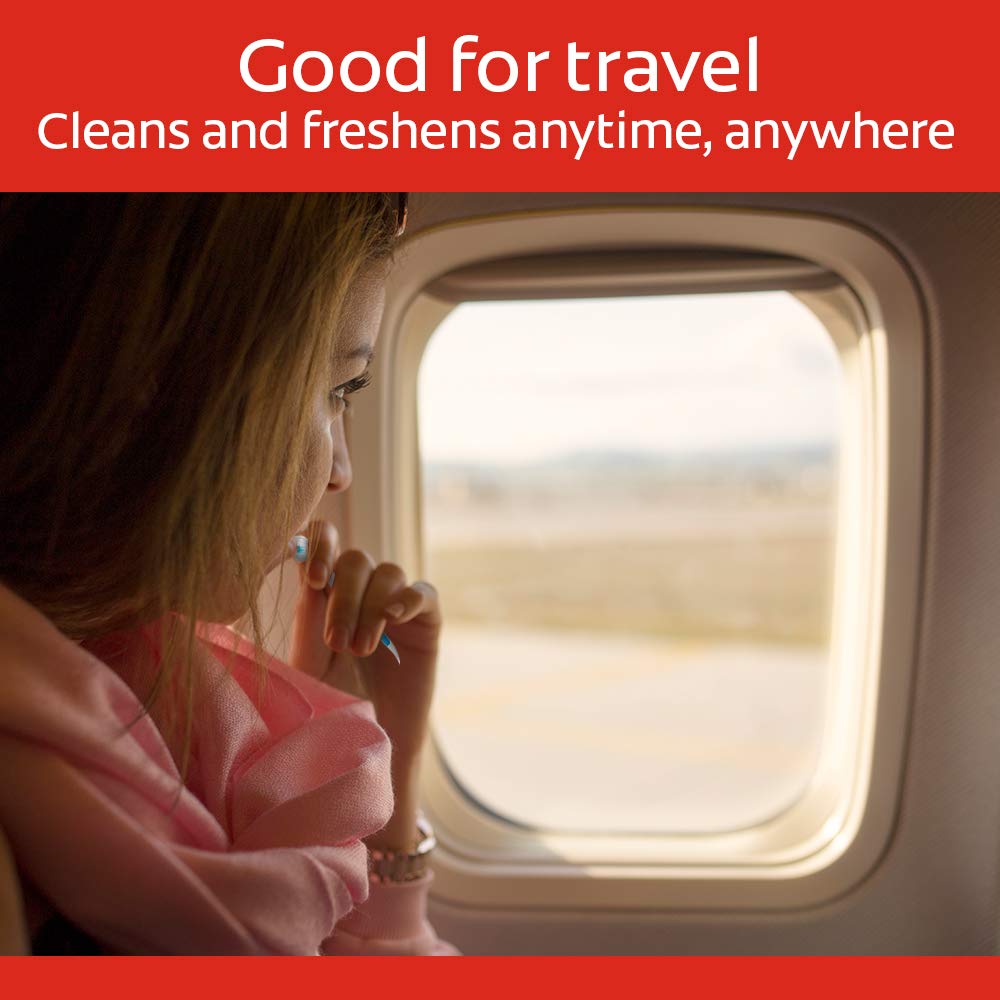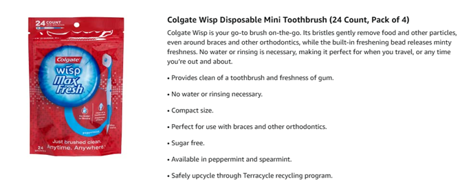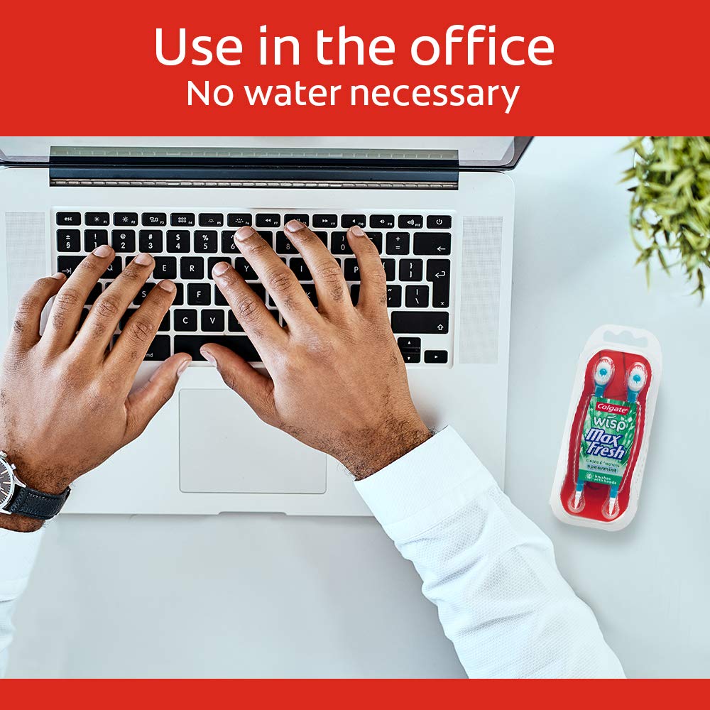 Get clean teeth and fresh breath on the go with the Colgate Max Fresh Wisp Disposable Mini Toothbrush, Peppermint. This pocket-sized mini-toothbrush, brush delivers the freshness of gum and the clean of a toothbrush in one effortlessly portable device. Its built-in, sugar-free peppermint bead easily dissolves and delivers a rush of minty freshness while the bristles gently remove food and other particles. A soft pick at the handle base of this disposable toothbrush removes food particles from any hard-to-reach areas. No water or rinsing is necessary. Recycle with Terracycle.