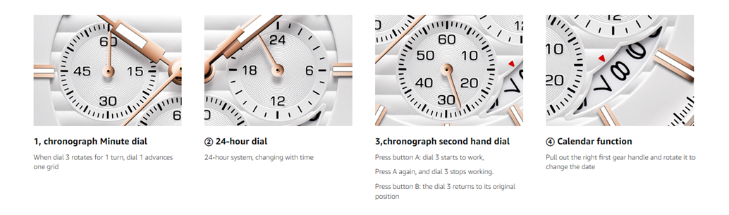 • FULL FUNCTIONAL CHRONOGRAPH AND WATERPROOF: Three Chronograph Sub-dial, Seconds sub-dial, Minute Sub-dial, 24 hour Sub-dial. Waterproof (30 M) - 3ATM. Perfect for all kind of business, casual, indoor and outdoor activities and daily use,but not suitable for swimming, bathing and sauna.