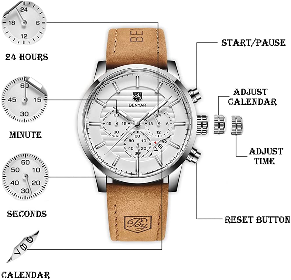 BENYAR Quartz Chronograph Waterproof Watches Business and Sport Design Leather Band Strap Wrist Watch for Men