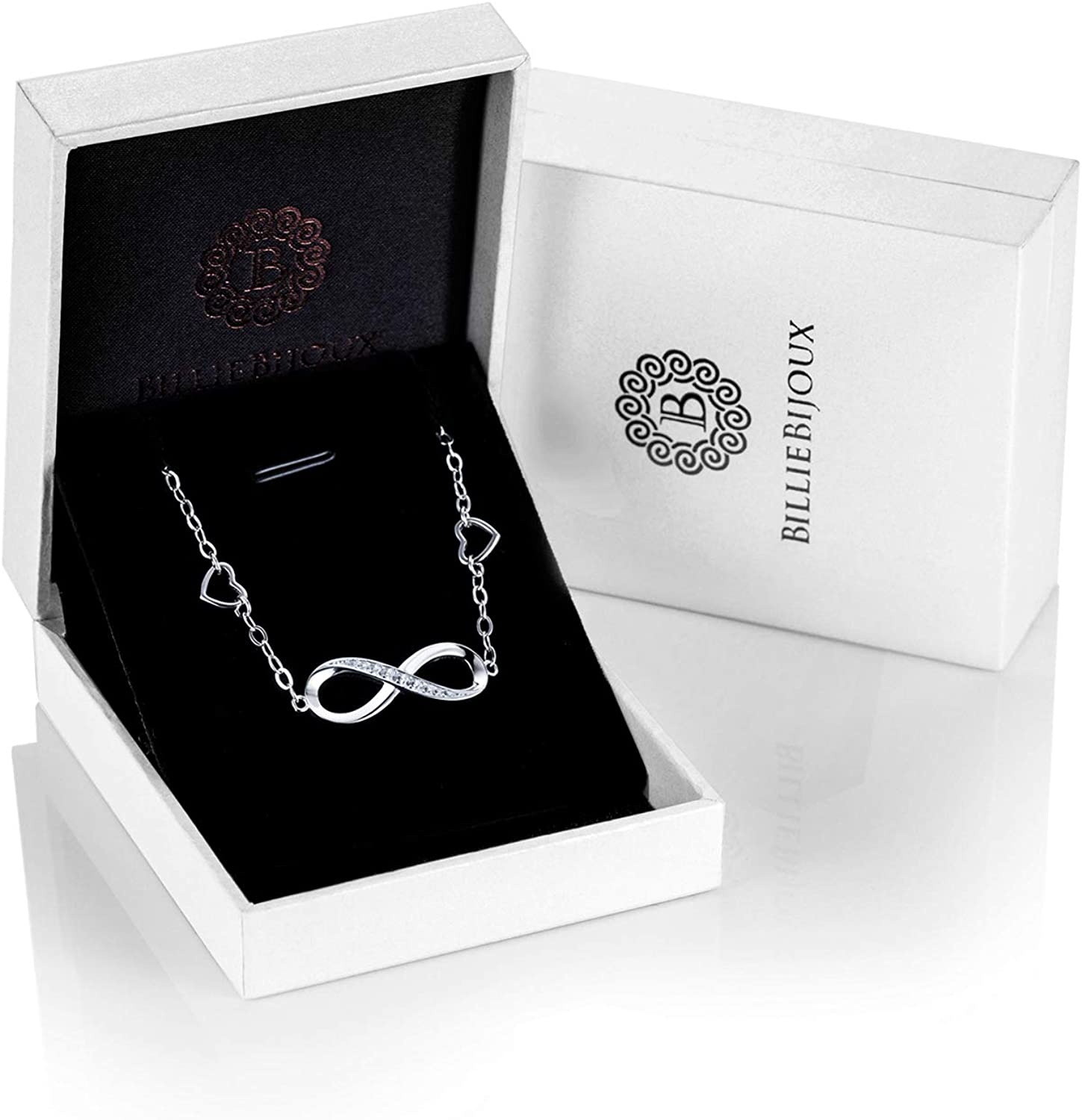 • ? SPECIFICATION ? BILLIE BIJOUX 925 sterling silver anklet bracelet Made of 925 Sterling Silver. Fastened with a sterling silver lobster clasp, this adjustable bracelet is punctuated by a beautiful infinity symbol, embellished with glittering white cubic zirconia to make it truly eye-catching. It also have 4 heart charms. Exquisite Polish Techniques and every item we create is a unique one-off design, never to be reproduced. Extension Design (22cm+5cm extension) to fit different wrist sizes