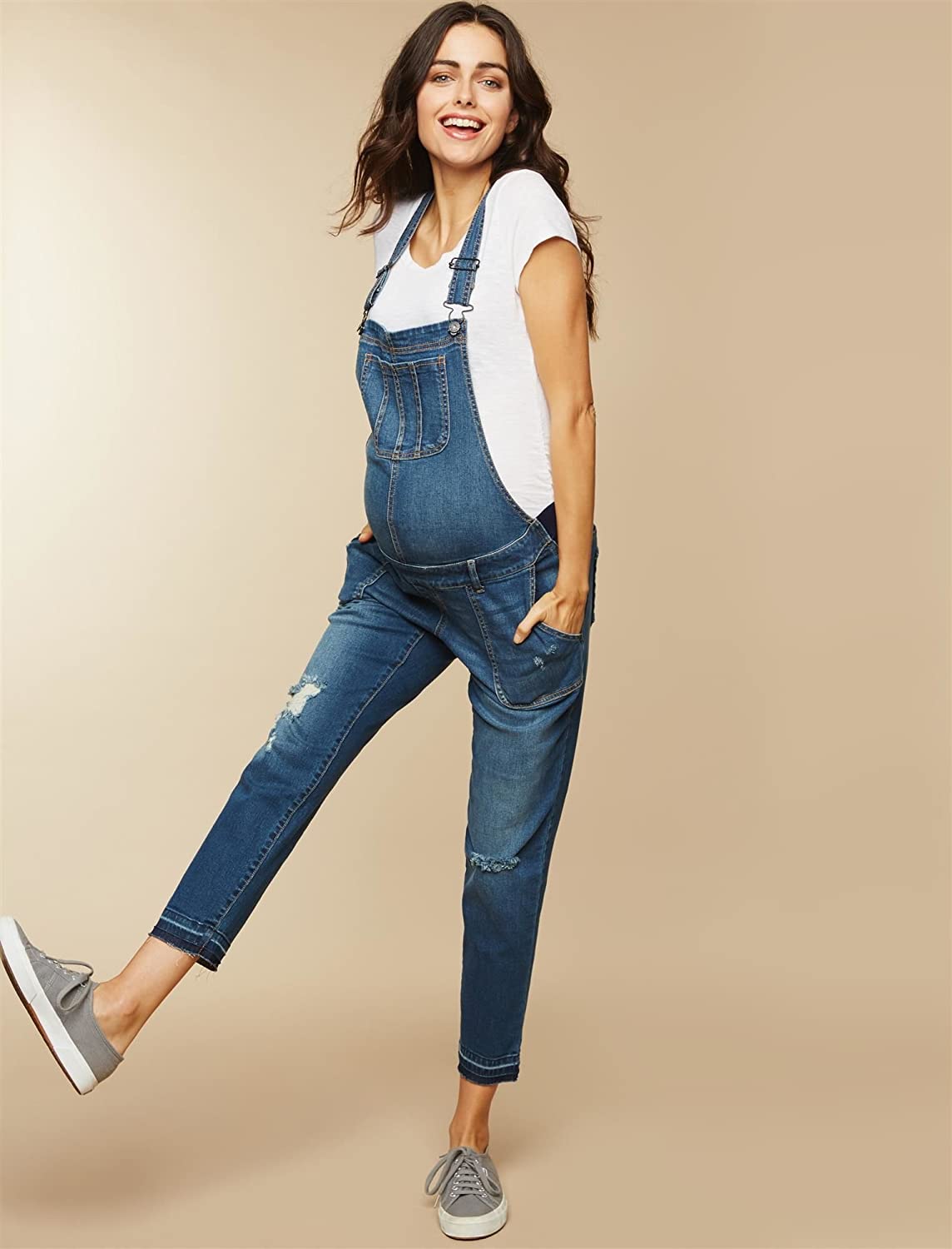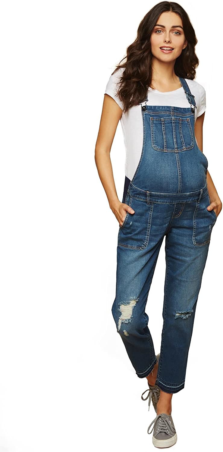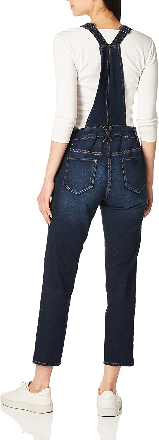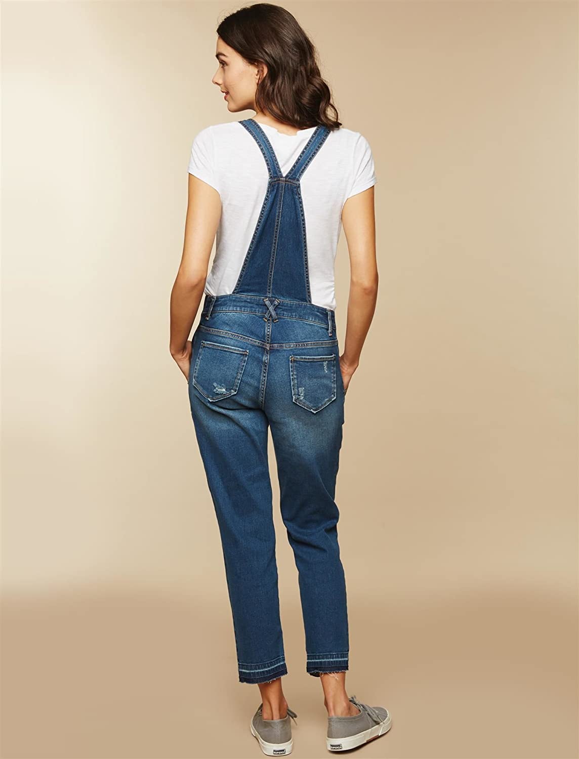 Side panel destructed skinny ankle length overall with 27.5 inch inseam and frayed let down hem