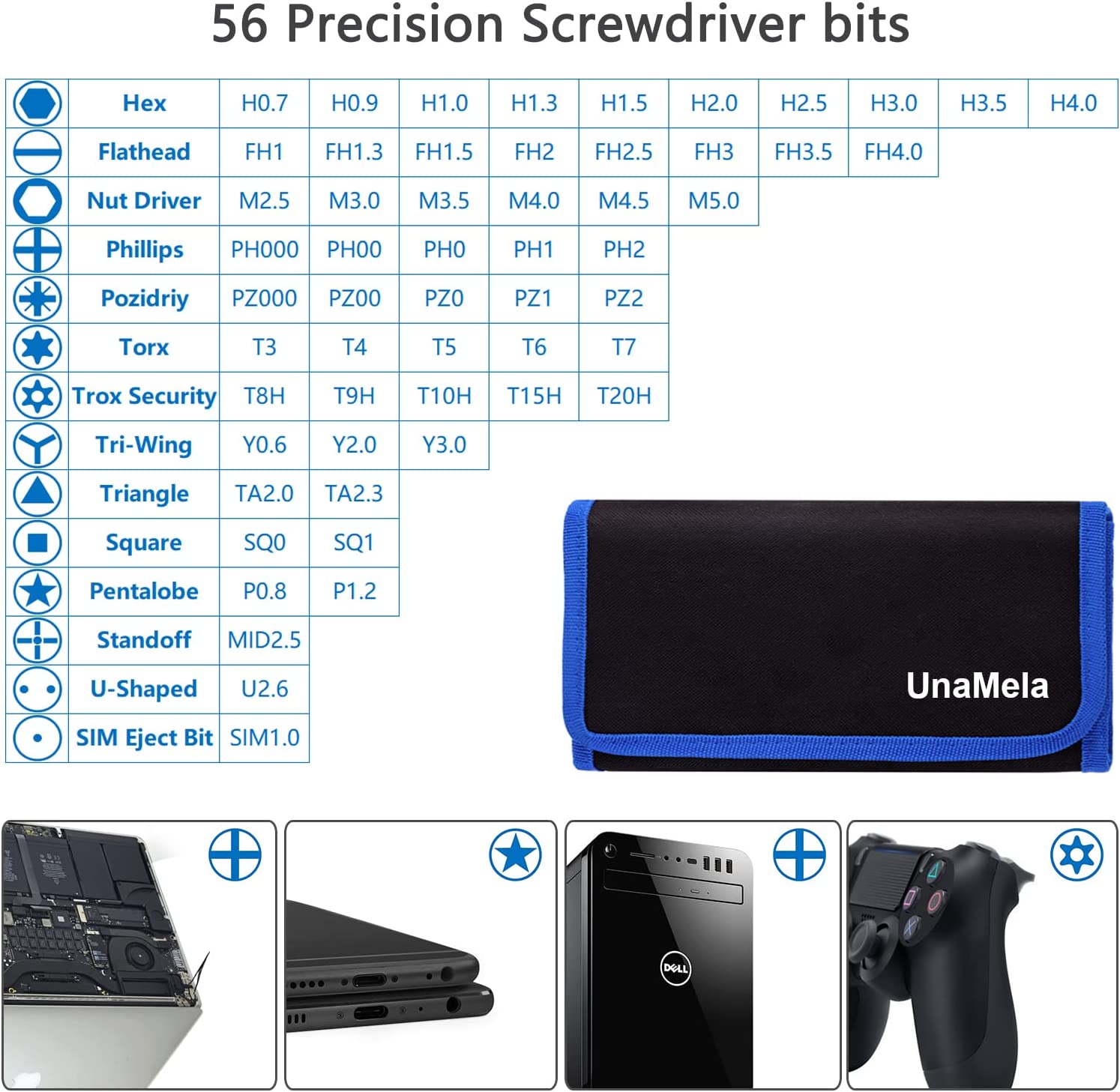 【Reliable Quality】 The 56 percision bits are CNC machined to be precise, and made of 60HRC CRV Steel which can resist abrasion, oxidation and corrosion, so the bits are sturdy, durable and not easily stripped. Each screwdriver bit (Torx, Flat, Phillips, Star, Hex, Triwing...) fits neatly into a marked slot for easy to find and storage. Flat and Phillips can use on computer, laptop, desk and other device. P2 can use to open the iPhone case. Triwing is a good helper to repair game controller.