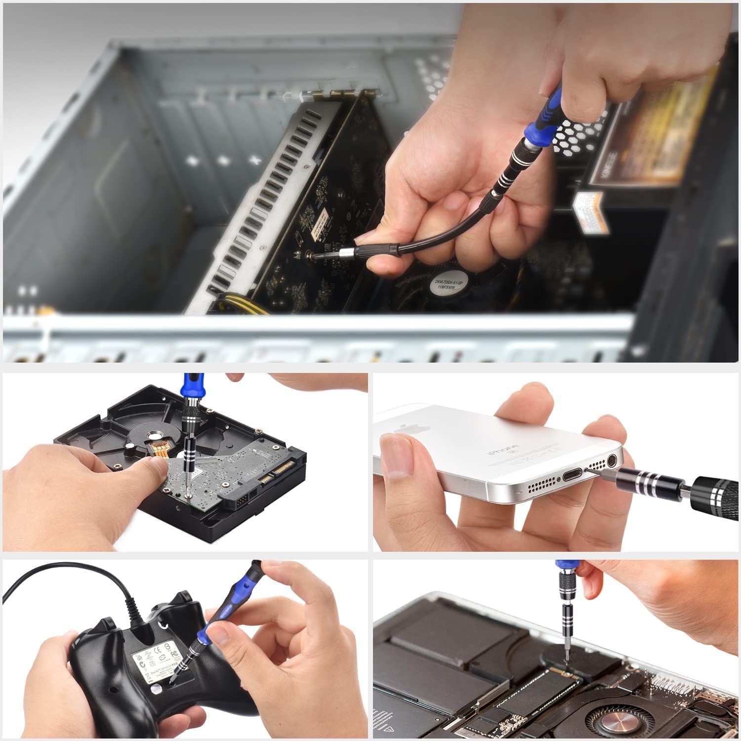 【Humanized Design】This pc tool kit is carefully designed by product engineers according to customer needs, for improving your repair efficiency and use experience. The surface of screwdriver is attached with non-slip particles, and the tail can be rotated 360°, providing a comfortable grip and helping you to remove the screw with one hand. 5.11-inch flexible shaft consists of double-layer CRV springs, which can bend 180° and rotate 360°, helping you to easily remove screws with complex angles.