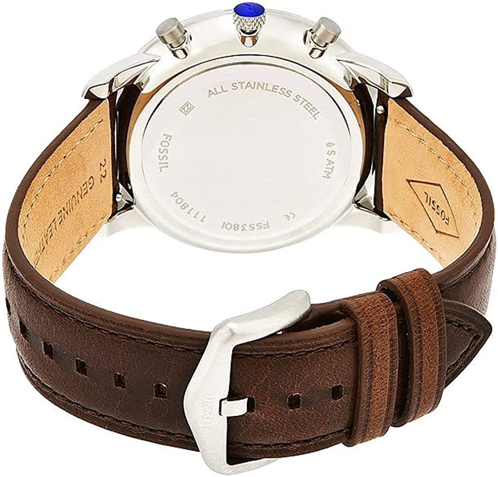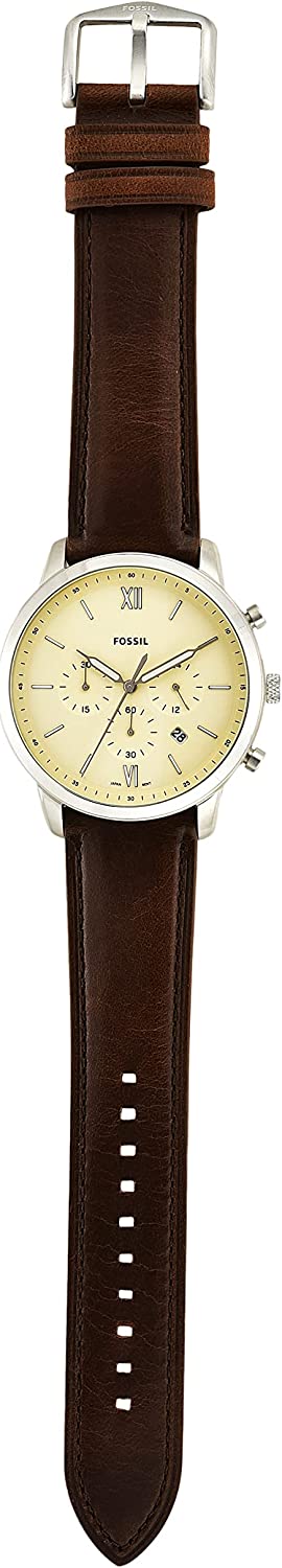 - Stainless steel case with cream satin dial; genuine brown leather band with adjustable buckle closure; interchangeable with all 22mm Fossil watch straps
